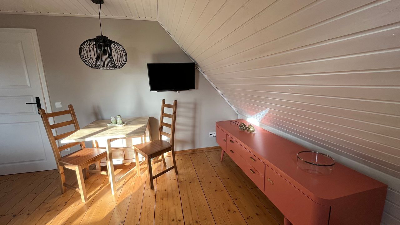 Die Ferienwohnung befindet sich im staatlich anerkannten Luftkurort Polchow. Sie wohnen im ersten Stock/Dach eines freistehenden ehemaligen Fischerhauses mit drei Ferienwohnungen. Die gemütliche Ferienwohnung mit viel Charme, Dielenböden und Dachschrägen wurde 2022 saniert und modern eingerichtet. Freuen Sie sich nach Ihren Aktivitäten auf der Insel auf Erholung und Ruhe in heimeliger Atomsphäre. Das Schlafzimmer ist mit einem 1,80 m breiten Bett und einem Kleiderschrank ausgestattet. Genießen Sie an sonnigen Tagen den Garten, den Sie auch zum Grillen nutzen können. Bitte haben Sie Verständnis dafür, dass wir Rauchen und Tierhaltung in der Wohnung nicht gestatten.Das von Feldern umgebene ruhige Dorf Polchow liegt am Jasmunder Bodden und ist ein Ortsteil des Ostseebades Glowe. Hier finden Sie Ruhe und Natur und sind trotzdem schnell an den Hotspots der Insel. Polchow bietet Ihnen eine Gaststätte. Im 4 km entfernten Sagard und in Glowe befinden sich verschiedene Super- und Einkaufsmärkte, eine Bäckerei, Apotheke, Restaurants etc. Der Kitespot am benachbarten Martinshafen ist perfekt fürAnfänger, da man weit ins Wasser laufen, noch sicher stehen und den Kite kontrollieren kann. Die Kiteschule Rügen Kite hat gleich nebenan ihr Zuhause. Zum feinen, weißen Ostseestrand in Glowe sind es 6 km mit dem Auto und 4,5 km/15min mit dem Fahrrad. Der längste Sandstrand auf Rügen bietet durch seine Größe viel Privatsphäre. Eine Surf- und Segelschule liegt direkt am Strand und bietet ein breites Angebot an Wassersportaktivitäten. Bei Regenwetter sind Sie in 4km in der Splash-Erlebniswelt mit Bade- und Saunalandschaft.