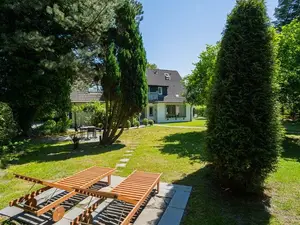 Wohnzimmer mit Sofa, zwei Sesseln und TV (Sat) mit DVD-Player. Essbereich mit Esstisch, 4 Stühlen und Anricht mit Mikrowelle. Direkter Zugang zum möblierten Balkon nach Südwesten mit Blick auf das grüne Gartengrundstück und den Waldesrand. Vom Wohnzimmer führt eine Treppe zum DG.