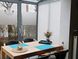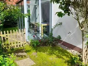 Neben den Schlafzimmern befindet sich im OG ein Duschbad mit WC. Im EG steht Ihnen ein Gäste-WC und der offene Wohnbereich mit einem tollen Winteergarten und einer komplett eingerichteten Küche zur Verfügung. Zum Außenbereich des Hauses gehören ein PKW-Stellplatz und ein Schuppen für Fahrräder. Der kleine von Hecken umfasste Garten mit Terrasse und Grillplatz bietet Ruhe und Erholung. Gartenmöbel und ein Grill sind selbstverständlich vorhanden.