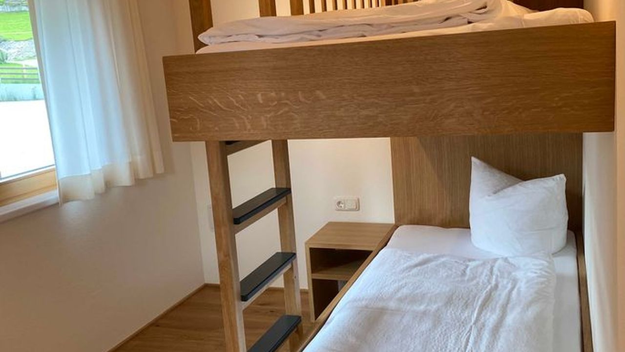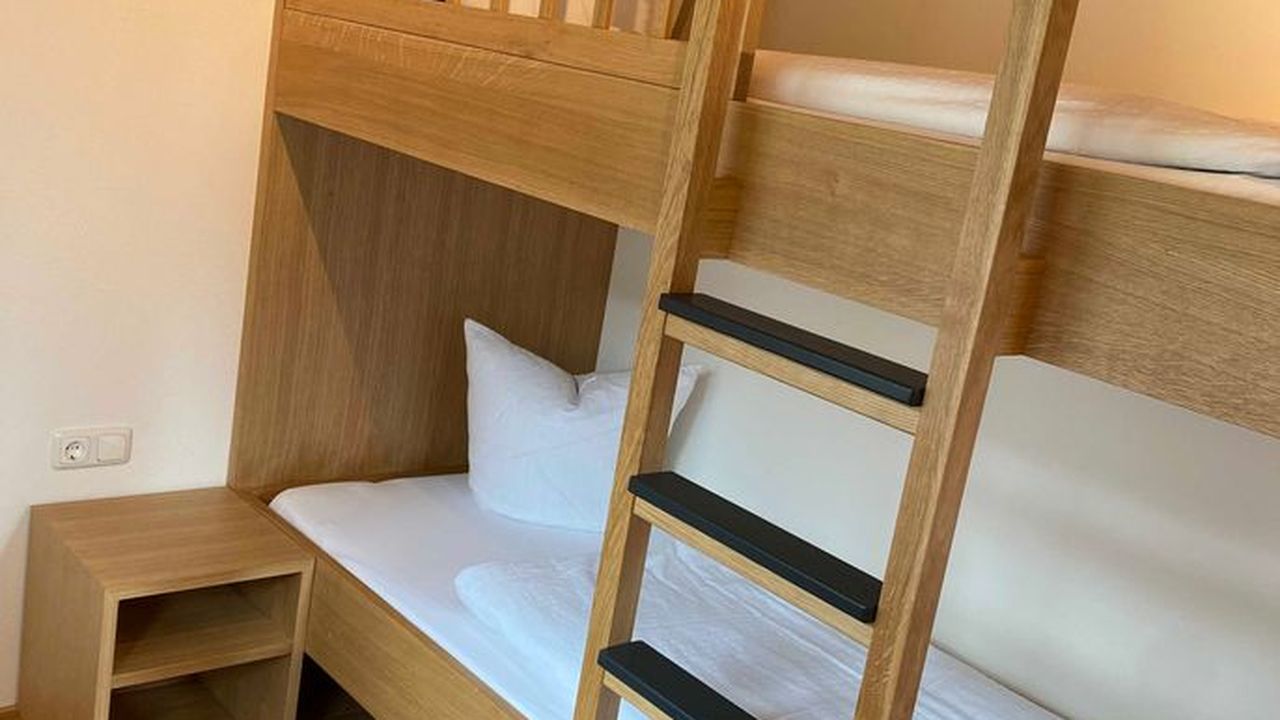 In der komplett neu renovierten (Mai 2022) Ferienwohnung befindet sich eine Garderobe, Doppelzimmer mit Zugang zum Balkon, ein weiteres Schlafzimmer mit Etagenbett, Bad (Dusche/WC) sowie eine gemütliche Wohnküche mit einladender Eckbank.Unsere Wohnungen sind so ausgestattet, dass Sie weder Bettwäsche, Handtücher, Geschirrtücher etc. mitzubringen haben. Kinderbett wird auf Wunsch ebenfalls bereitgestellt. In der Küche gibt es eine Filterkaffeemaschine, einen Vierplattenherd mit Backofen und eine Geschirrspülmaschine, einen SAT-TV Flachbild-Fernseher und GRATIS W-LAN.