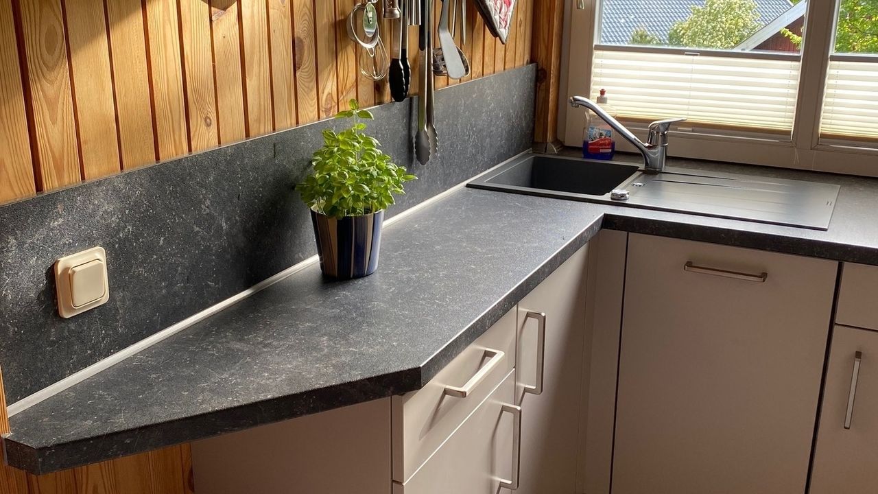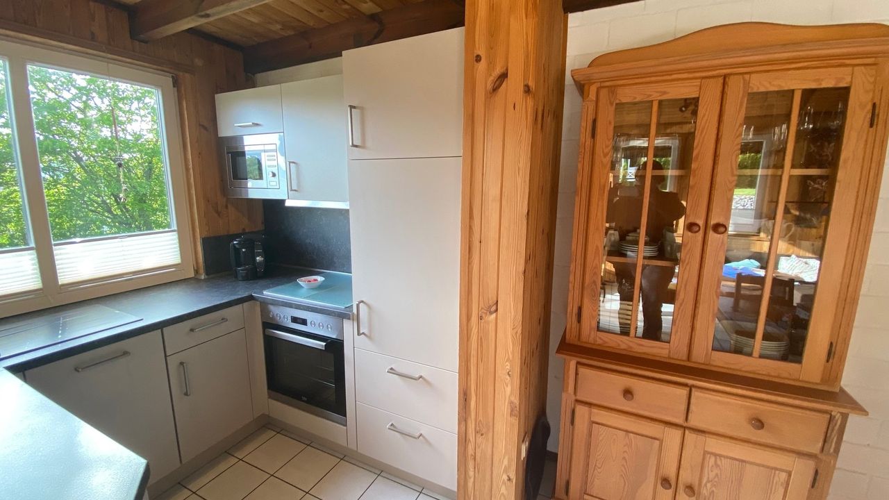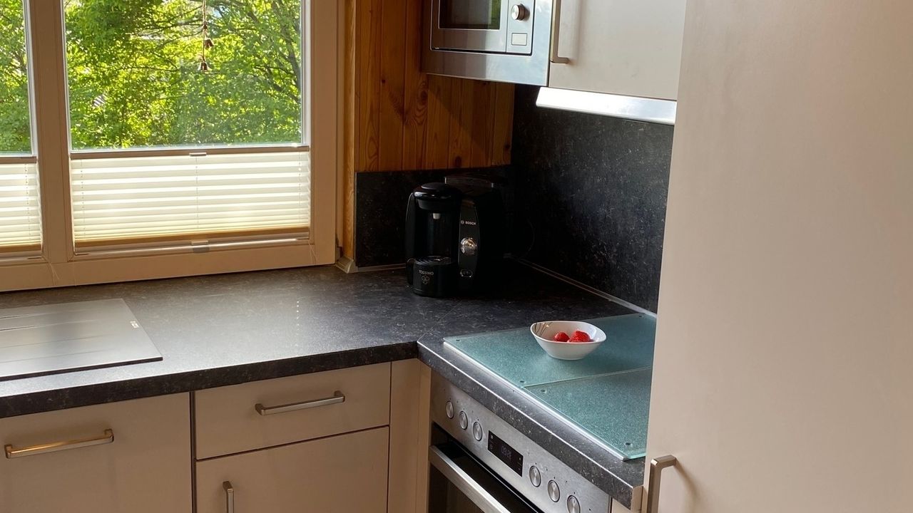 Die zum Wohnraum offene und neue Küche verfügt u.a. über einen Backofen und Ceranfeld, Geschirrspülmaschine, einen Kühlschrank mit Gefrierfach, Mikrowelle, Toaster, Wasserkocher und viele weitere wichtige Utensilien.