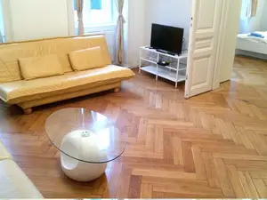 Diese geräumige Unterkunft liegt im 1. Stock auf der Gebäuderückseite mit Blick in den Garten. Sie ist somit ausgesprochen ruhig und lichtdurchflutet. Das großzügige Apartment verfügt über 3 Schlafzimmer (1 großes, 1 mittleres, 1 kleines) - Betten für max. 11 Personen (2x Doppelbett, 1 Einzelbett, 1 Stockbett, 2 Schlafsofa für je 2 Personen), 1 sehr großes und elegantes Wohnzimmer, einem Esszimmer mit Küchenzeile, einem Badezimmer und einem getrennten WC.