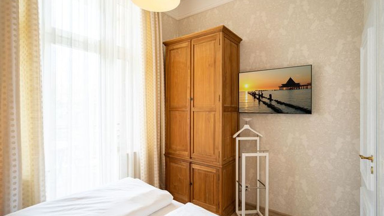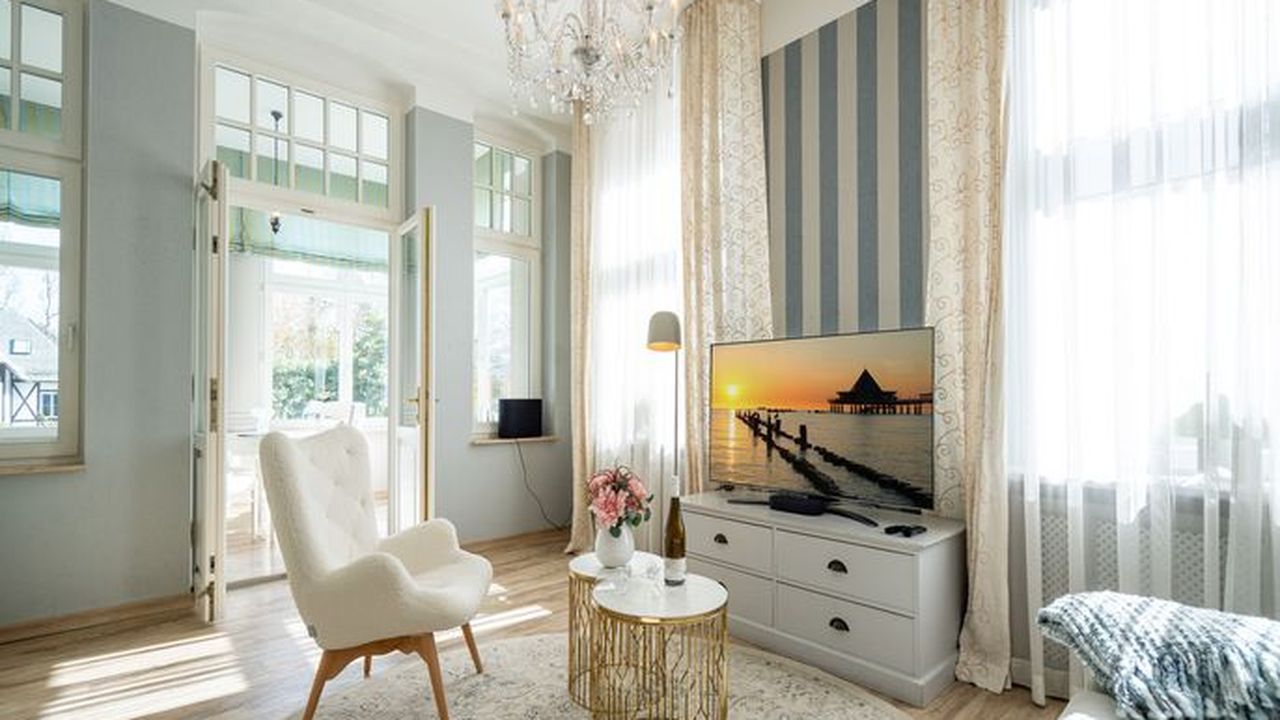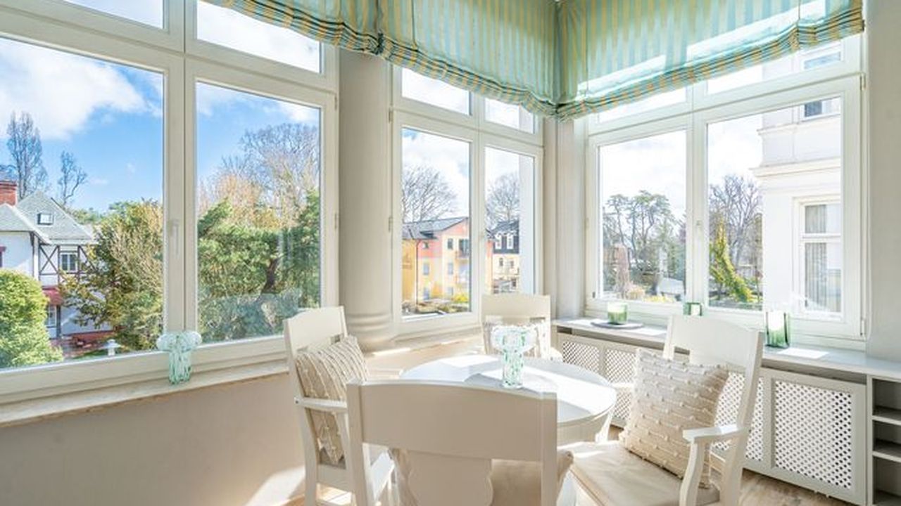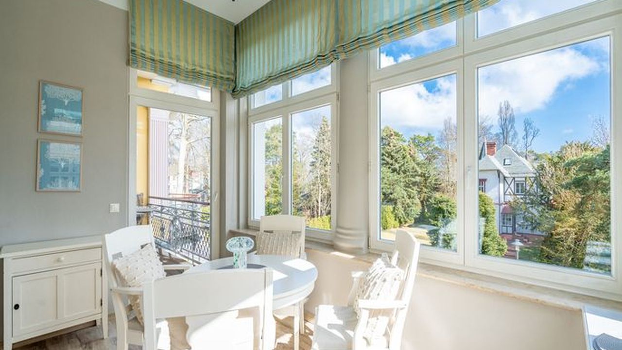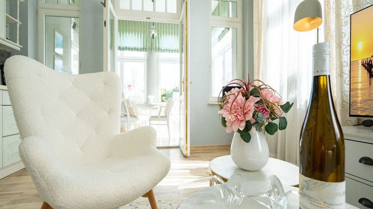 Stil, Charme und Komfort! In dieser wunderschönen 2-Raum-Ferienwohnung (53 m²) im 1. Obergeschoss der Villa Aegir, werden Sie entspannte Urlaubstage verbringen. Der helle Wohnbereich mit Couch, Lesesessel und TV wird durch die Landhausküchenzeile ergänzt. Daran schließt sich der schöne Wintergarten mit Essgruppe an, der sicher schnell zu Ihrem Lieblingsplatz in der Wohnung avanciert. Das gemütliche Schlafzimmer mit Doppelbett (1,60 m) verfügt über einen zweiten TV. Für Ihren Komfort sind die Betten bei der Anreise bezogen und Handtücher liegen bereit (Erstausstattung). Auf Wunsch stellen wir für unsere kleinen Gäste ein Kinderreisebett (ohne zusätzliche Matratze [&] Bettzeug) und einen Kinderhochstuhl ( gegen einen Aufpreis) zur Verfügung. Das Bad ist mit einer Dusche ausgestattet. Der Balkon mit Gartenmöbeln bietet Ausblick auf die schönen Villen in der Nachbarschaft. ( 1 Pkw-Stellplatz am Haus, WLAN-Netz kostenfrei)Außen erwartet Sie ein Schmuckstück der klassischen Bäderstilarchitektur. Innen modernes Design, gepaart mit 5-Sternekomfort. Treten Sie ein und fühlen Sie sich wohl! Unser neu gestaltetes 2-Raum-Appartement überzeugt mit geschmackvoller Einrichtung und modernem Komfort. Die Villa Aegir ist nur wenige Schritte vom Strand der Promenade entfernt. Im Haus stehen Sauna, Waschmaschine und Trockner gegen Gebühr (gemeinschaftliche Nutzung) zur Verfügung. Hinter dem Haus befindet sich eine Räumlichkeit, um Fahrräder abzuschließen. Auch ein WLAN-Anschluss (kostenfrei) ist zu nutzen.