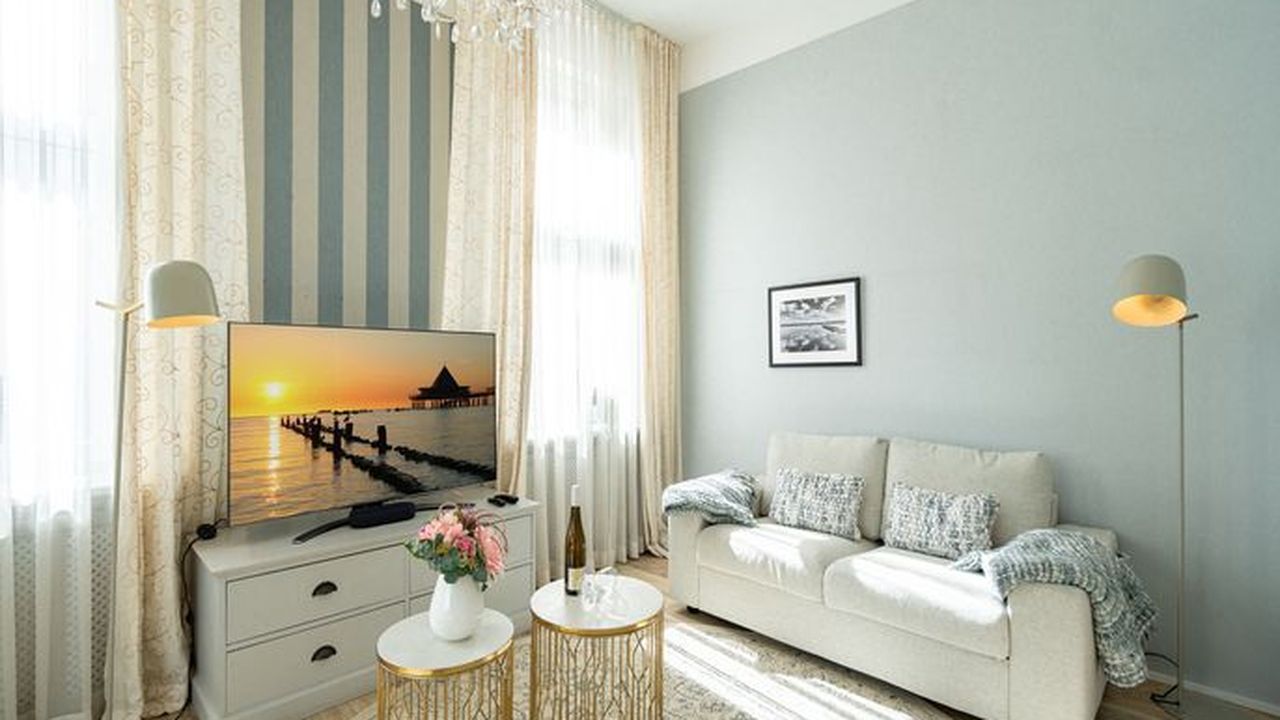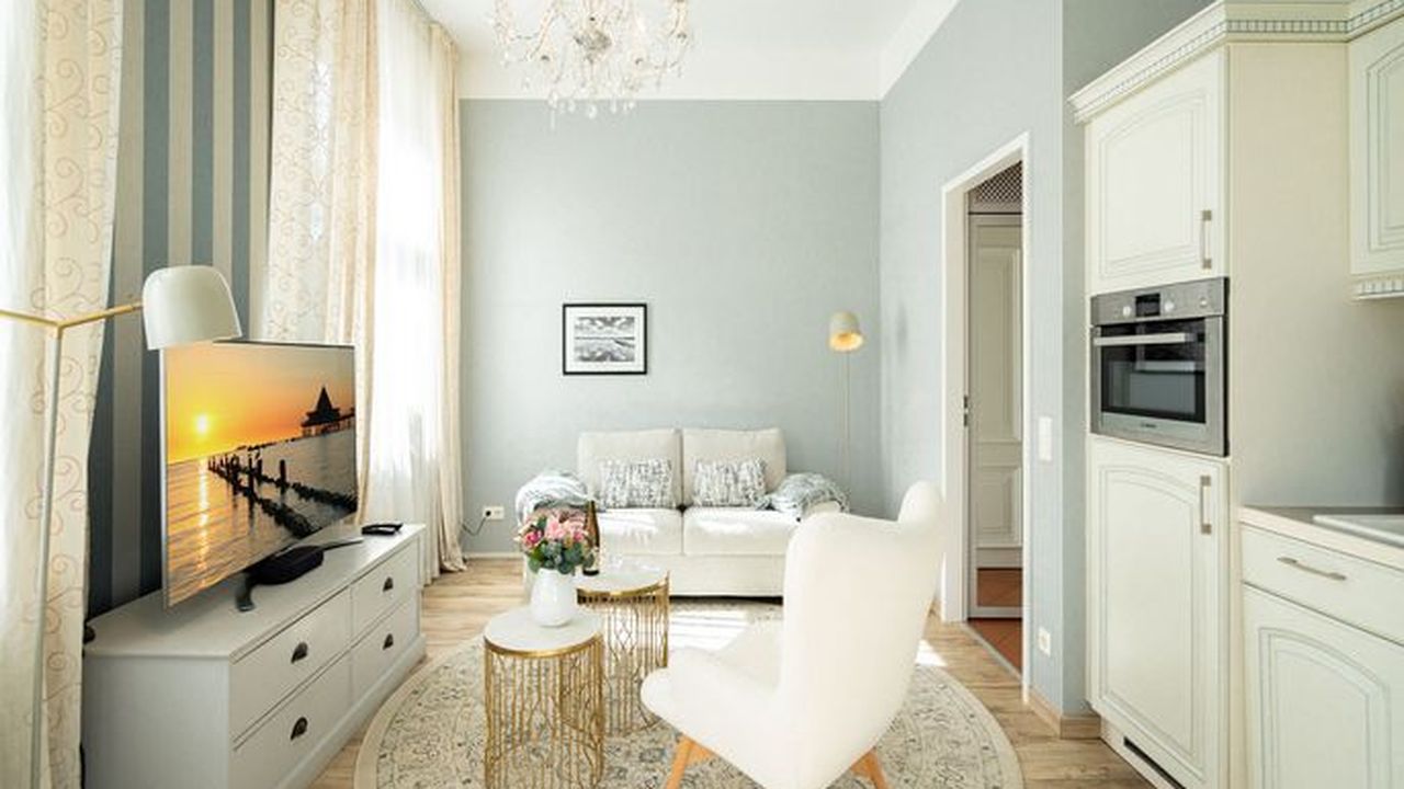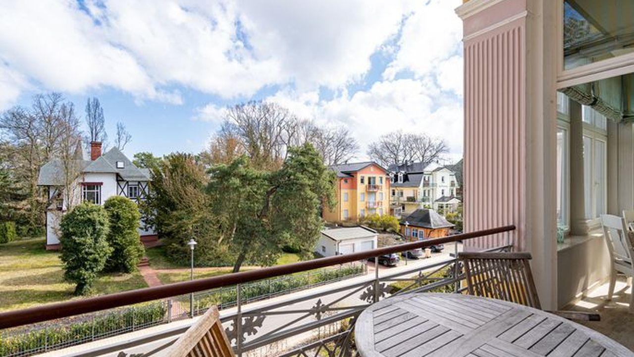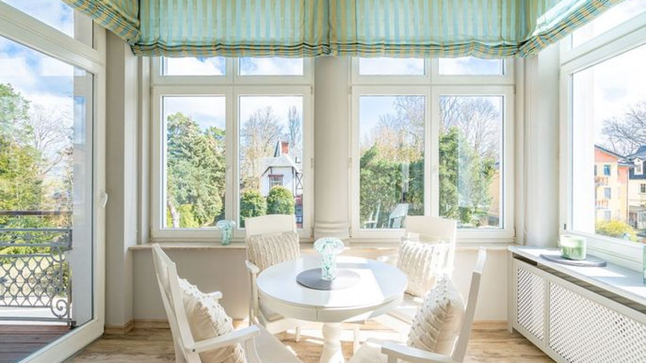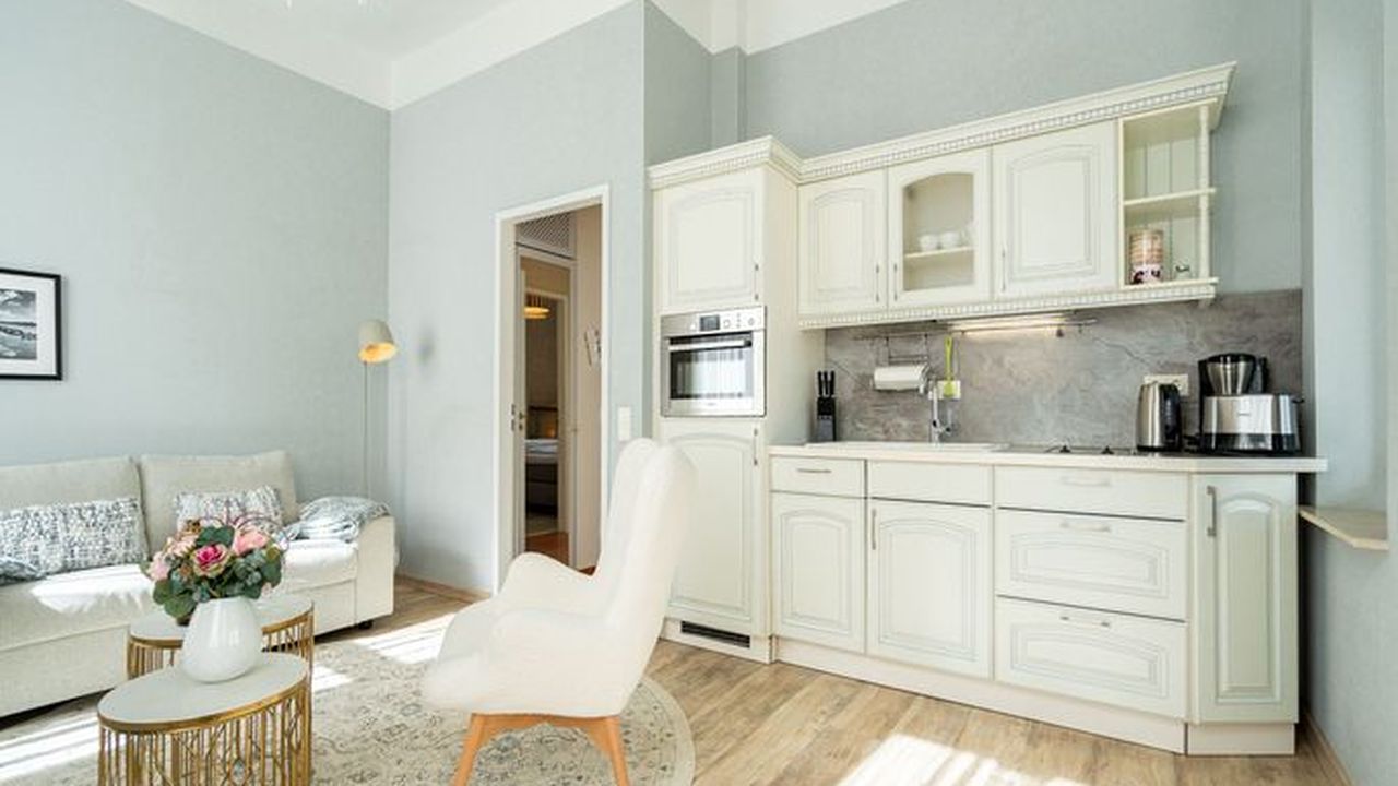 Stil, Charme und Komfort! In dieser wunderschönen 2-Raum-Ferienwohnung (53 m²) im 1. Obergeschoss der Villa Aegir, werden Sie entspannte Urlaubstage verbringen. Der helle Wohnbereich mit Couch, Lesesessel und TV wird durch die Landhausküchenzeile ergänzt. Daran schließt sich der schöne Wintergarten mit Essgruppe an, der sicher schnell zu Ihrem Lieblingsplatz in der Wohnung avanciert. Das gemütliche Schlafzimmer mit Doppelbett (1,60 m) verfügt über einen zweiten TV. Für Ihren Komfort sind die Betten bei der Anreise bezogen und Handtücher liegen bereit (Erstausstattung). Auf Wunsch stellen wir für unsere kleinen Gäste ein Kinderreisebett (ohne zusätzliche Matratze [&] Bettzeug) und einen Kinderhochstuhl ( gegen einen Aufpreis) zur Verfügung. Das Bad ist mit einer Dusche ausgestattet. Der Balkon mit Gartenmöbeln bietet Ausblick auf die schönen Villen in der Nachbarschaft. ( 1 Pkw-Stellplatz am Haus, WLAN-Netz kostenfrei)Außen erwartet Sie ein Schmuckstück der klassischen Bäderstilarchitektur. Innen modernes Design, gepaart mit 5-Sternekomfort. Treten Sie ein und fühlen Sie sich wohl! Unser neu gestaltetes 2-Raum-Appartement überzeugt mit geschmackvoller Einrichtung und modernem Komfort. Die Villa Aegir ist nur wenige Schritte vom Strand der Promenade entfernt. Im Haus stehen Sauna, Waschmaschine und Trockner gegen Gebühr (gemeinschaftliche Nutzung) zur Verfügung. Hinter dem Haus befindet sich eine Räumlichkeit, um Fahrräder abzuschließen. Auch ein WLAN-Anschluss (kostenfrei) ist zu nutzen.