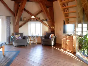 Oberhalb der Wohnküche erwartet Sie ein Wohngenuss der besonderen Art: Mächtige Holzbalken geben dem großen Raum Behaglichkeit und Stuktur. Fenster in allen Himmelsrichtungen lassen ihn zu jeder Tageszeit in einem anderen Licht erscheinen.