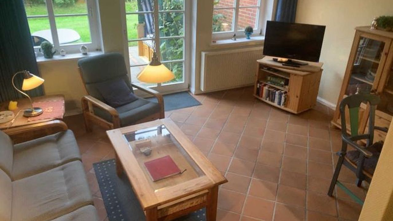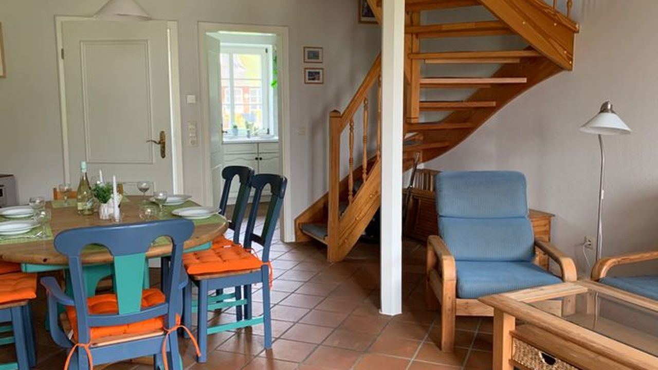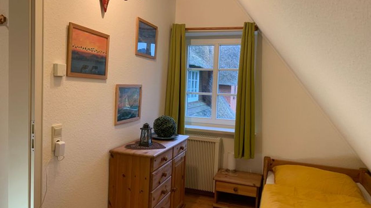 Der Friesenhof ist ein im typisch friesischen Stil erbautes Reetdachgebäude mit eigenständigen Hausteilen, gelegen im Kurzentrum Nordstrand. Der im Sommer 2022 frisch renovierte Hausteil ist ca. 90qm groß und ist für bis zu 6 Personen geeignet. Im Erdgeschoss befinden sich das geräumige Wohnzimmer mit Wohn- und Essbereich, die seperate komplett ausgestattet Einbauküche mit Spülmaschine, Mikrowelle usw. Vom Flur aus ist ein zusätzliches Gäste-WC zu erreichen, und vom Wohnzimmer aus geht es auf die möblierte zum Süden liegende Außenterrasse mit eigenem Strandkorb. Zwei Schlafzimmer, eines mit einem Doppelbett und ein weiteres mit zwei Einzelbetten, sowie Dusche/WC befinden sich im 1. Stock, ein drittes Schlafzimmer mit ebenfalls zwei Einzelbetten im oberen als Galerie ausgebauten Giebelzimmer. Das Haus verfügt über einen Glasfaseranschluss.Bettwäsche und Handtücher können optional dazu gebucht werden.