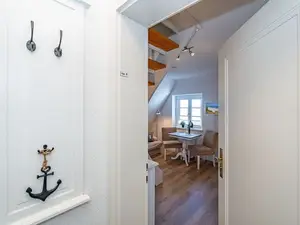 Im Sylt-Style eingerichtete Wohnung im 1. OG mit Wattblick.Der Wohnbereich mit gut ausgestatteter Küchenzeile inkl. Geschirrspüler und Mikrowelle verfügt weiter über ein Sofa sowie einen Esstisch mit zwei Stühlen.