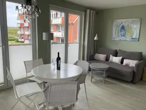 Zu den weiteren Vorzügen des Apartments zählt der Balkon, von dem aus Sie die frische Nordseeluft und einen Ausblick auf die umgebende Dünenlandschaft genießen können. Hier bieten sich entspannte Stunden an der frischen Luft an.