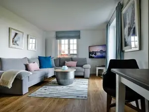 Im Erdgeschoss befindet sich das Wohnzimmer mit großem Sofa und Fernseher, sowie die Küchenzeile und ein Essbereich.Vom Wohnzimmer aus hat man Zugang auf die große Eckterrasse mit einen wunderschönen Blick auf das Wattenmeer.