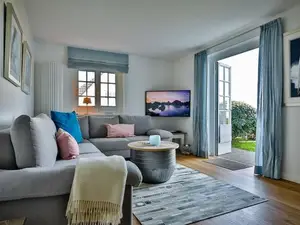In der Saison stehen Gartenmöbel und ein Strandkorb zur Verfügung. Von Mai bis September befindet sich auf der Terrasse ein eigener Strandkorb.