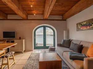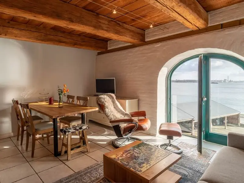 Wohnen mit direktem Blick auf die Kieler Innenförde. Verbringen Sie einzigartige Tage im denkmalgeschützten Kanalpackhaus in Holtenau. Die 2-Zimmerwohnung befindet sich im ehemaligen Lagerhaus am Tiessenkai Holtenau. Das Apartment besticht mit seinem einzigartigen Flair. So finden sich überall in der Wohnung Holzkonstruktionen und Holzbalken, die den Charakter des 270 Jahren alten Hauses widerspiegeln.Die Wohnung im zweiten Stock ist über eine Eingangstreppe und dem Aufzug zu erreichen. Vom Eingang gelangen Sie direkt in den kleinen Wohnungsflur, wo Sie Ihre Schuhe und Jacken lagern können. Mit Blick auf die Kieler Innenförde können Sie im Wohn- und Essbereich die Seele baumeln lassen. Als Highlight ist hier das halbrunde, bodentiefe Fenster zu nennen, welches sich komplett öffnen lässt. Durch die ehemalige Ladeluke können Sie nicht nur die Schleuseninsel, den Eingang des Nord-Ostsee-Kanals und die Kieler Innenförde sowie das Treiben auf dem Wasser betrachten, sondern blicken auch direkt auf den belebten und beliebten Tiessenkai, der Flaniermeile des Stadtteils Holtenau. Im Wohnbereich neben dem Fenster befindet sich ein gemütliches Loungesofa sowie ein großer Esstisch aus Holz für vier Personen. Ein Sideboard bietet genügend Stauraum für Sie. Auf der Kommode befindet sich ein Flachbild-TV. Gegenüber vom Essbereich gelangen Sie in die offene Küche. Die Küchenzeile ist umfänglich ausgestattet. So befindet sich neben einem Kühlschrank inklusive Gefrierfach auch ein Geschirrspüler und Backofen in der Küche.