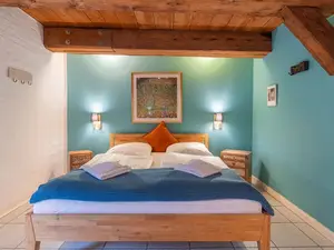 Im zweiten Zimmer befindet sich der Schlafbereich. Hier steht Ihnen ein 1,80m Doppelbett sowie ein großer Kleiderschrank während Ihres Aufenthalts zur Verfügung. Die gesamte Ferienwohnung ist mit Steinfliesen ausgelegt. Das innenliegende Badezimmer ist mit einem WC, Waschbecken und einer geräumigen Dusche ausgestattet.