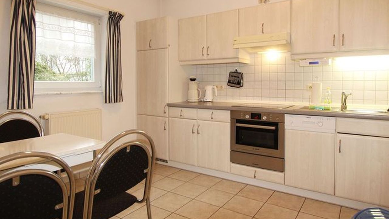 Die geschlossene Küche ist vollständig ausgestattet und umfasst einen 4-Platten-Elektroherd, Backofen, Kühlschrank mit Gefrierfach, Spülmaschine, Wasserkocher, Kaffeemaschine, Toaster sowie umfassendes Küchenzubehör, Geschirr und Besteck. Damit steht dem Zubereiten gemeinsamer Mahlzeiten nichts im Wege. Die vorhandene Waschmaschine zur Eigennutzung sowie ein Staubsauger bieten zusätzlichen Komfort während Ihres Aufenthalts.