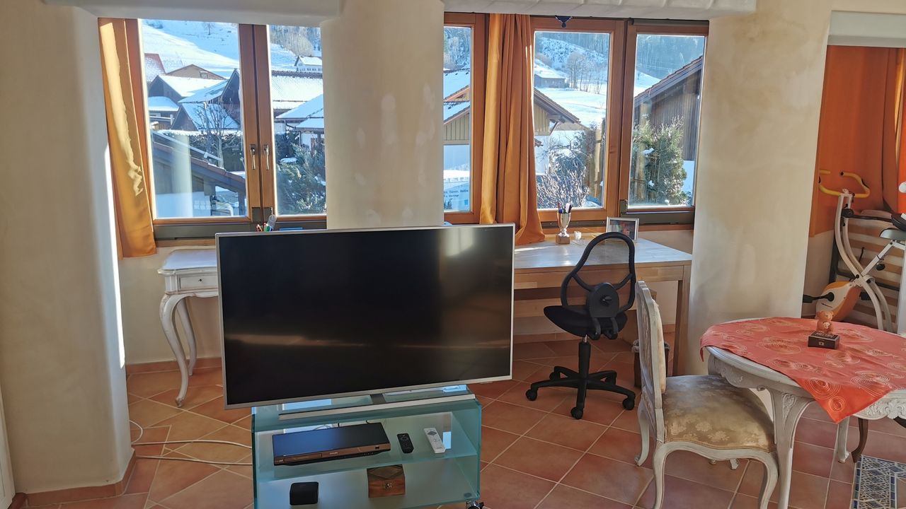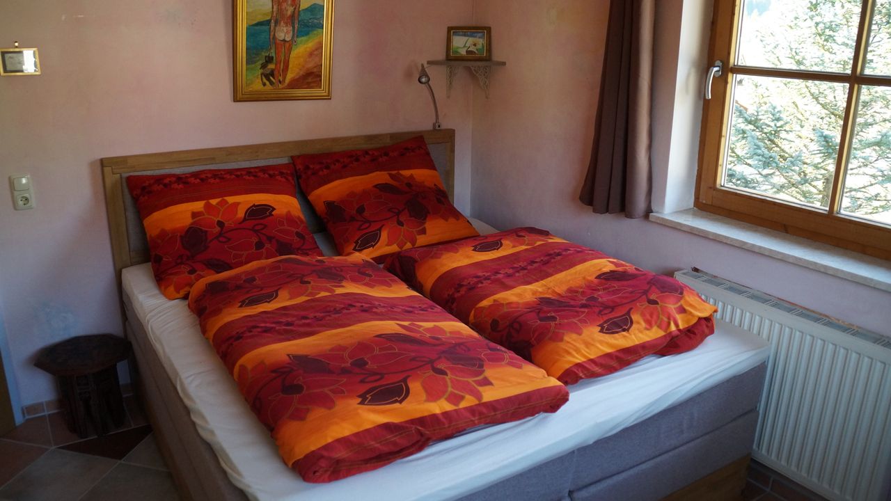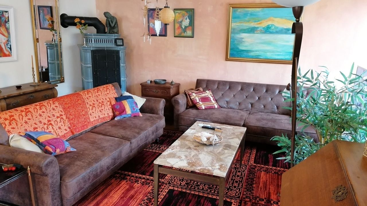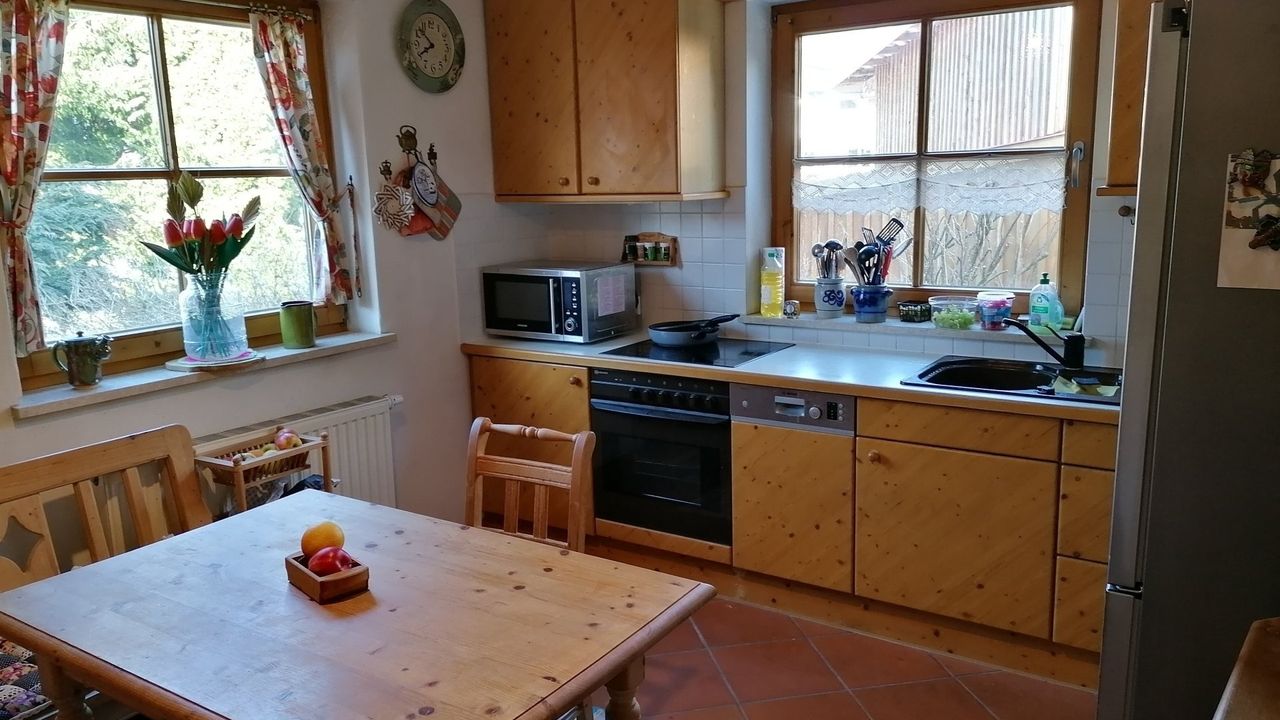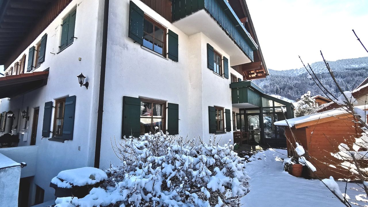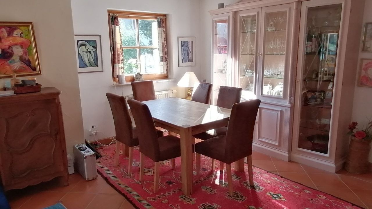 Diese wunderschöne Wohnung verfügt über 5 Zimmer mit liebevoller Ausstattung. Der große Wintergarten mit Fussbodenheizung im Erdgeschoss hat Zugang zum Garten mit kleiner Terrasse. Angrenzend befindet sich das große Wohnzimmer mit Couchecke, Fernseher und separatem Esstisch. Die typische Landhausküche mit Kühl-Gefrierschrank, Cerankochfeld, Mikrowelle etc. hat ebenfalls eine Eckbank mit Sitzgelegenheiten und Küchentisch. Die untere Etage verfügt zudem über eine Gästetoilette. Über die Wendeltreppe oder das Treppenhaus gelangen Sie in das erste Obergeschoss mit einem zum Wintergarten ausgebauten Balkon und einem weiteren Balkon mit Bergblick sowie ein Badezimmer mit Dusche und Badewanne. Dort befinden sich auch Schlafzimmer mit Boxspringbett sowie ein weiteres kombiniertes Wohn-Schlafzimmer mit einem Einzelbett und einem Doppelbett und einem Zugang zum Balkon. Eine Garage mit Rolltor und Steuerung per Fernbedienung steht Ihnen ebenfalls zur Verfügung.Durch die vielen selbstgemalten Bilder und Accessoires verfügt das Haus über einen besonderen Charme.
