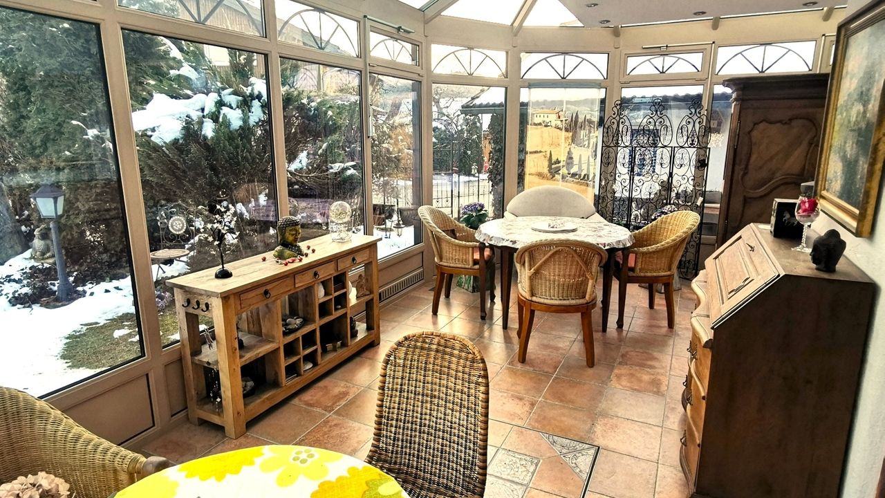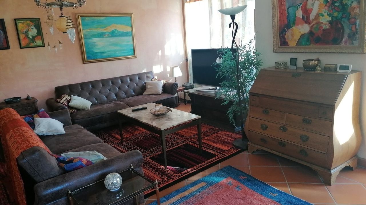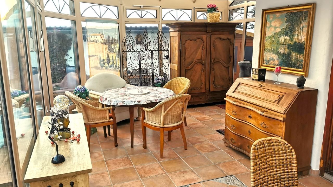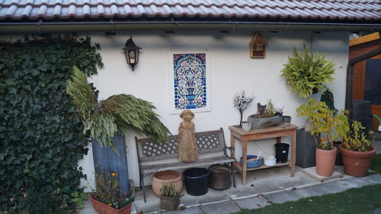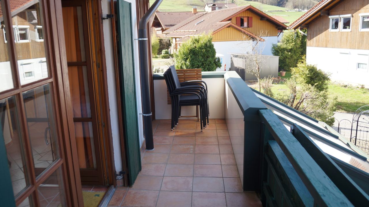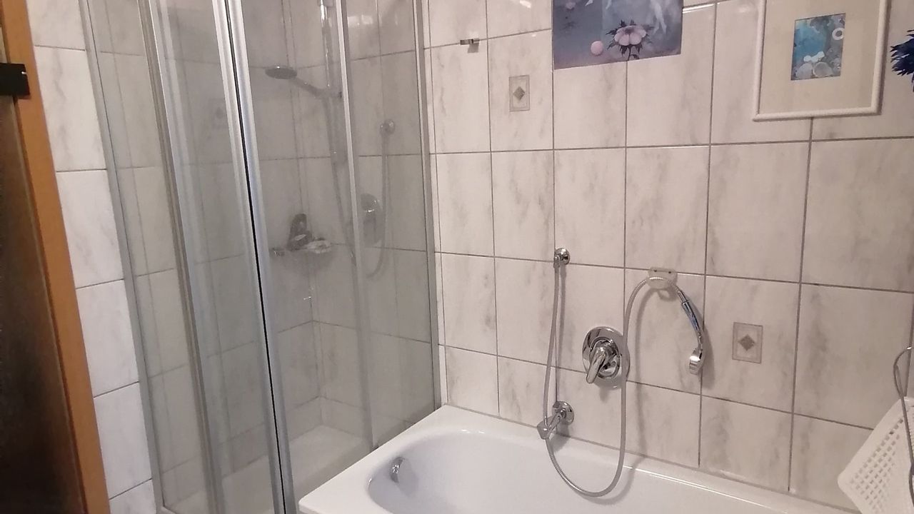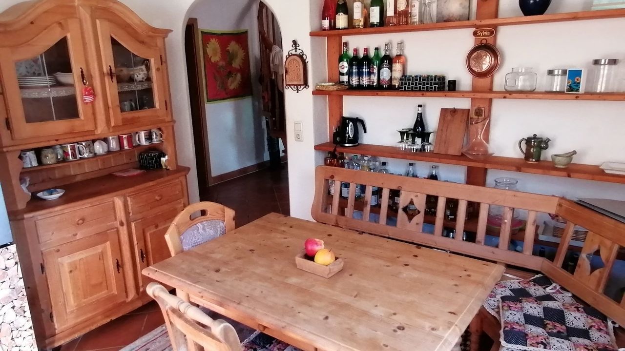 Diese wunderschöne Wohnung verfügt über 5 Zimmer mit liebevoller Ausstattung. Der große Wintergarten mit Fussbodenheizung im Erdgeschoss hat Zugang zum Garten mit kleiner Terrasse. Angrenzend befindet sich das große Wohnzimmer mit Couchecke, Fernseher und separatem Esstisch. Die typische Landhausküche mit Kühl-Gefrierschrank, Cerankochfeld, Mikrowelle etc. hat ebenfalls eine Eckbank mit Sitzgelegenheiten und Küchentisch. Die untere Etage verfügt zudem über eine Gästetoilette. Über die Wendeltreppe oder das Treppenhaus gelangen Sie in das erste Obergeschoss mit einem zum Wintergarten ausgebauten Balkon und einem weiteren Balkon mit Bergblick sowie ein Badezimmer mit Dusche und Badewanne. Dort befinden sich auch Schlafzimmer mit Boxspringbett sowie ein weiteres kombiniertes Wohn-Schlafzimmer mit einem Einzelbett und einem Doppelbett und einem Zugang zum Balkon. Eine Garage mit Rolltor und Steuerung per Fernbedienung steht Ihnen ebenfalls zur Verfügung.Durch die vielen selbstgemalten Bilder und Accessoires verfügt das Haus über einen besonderen Charme.