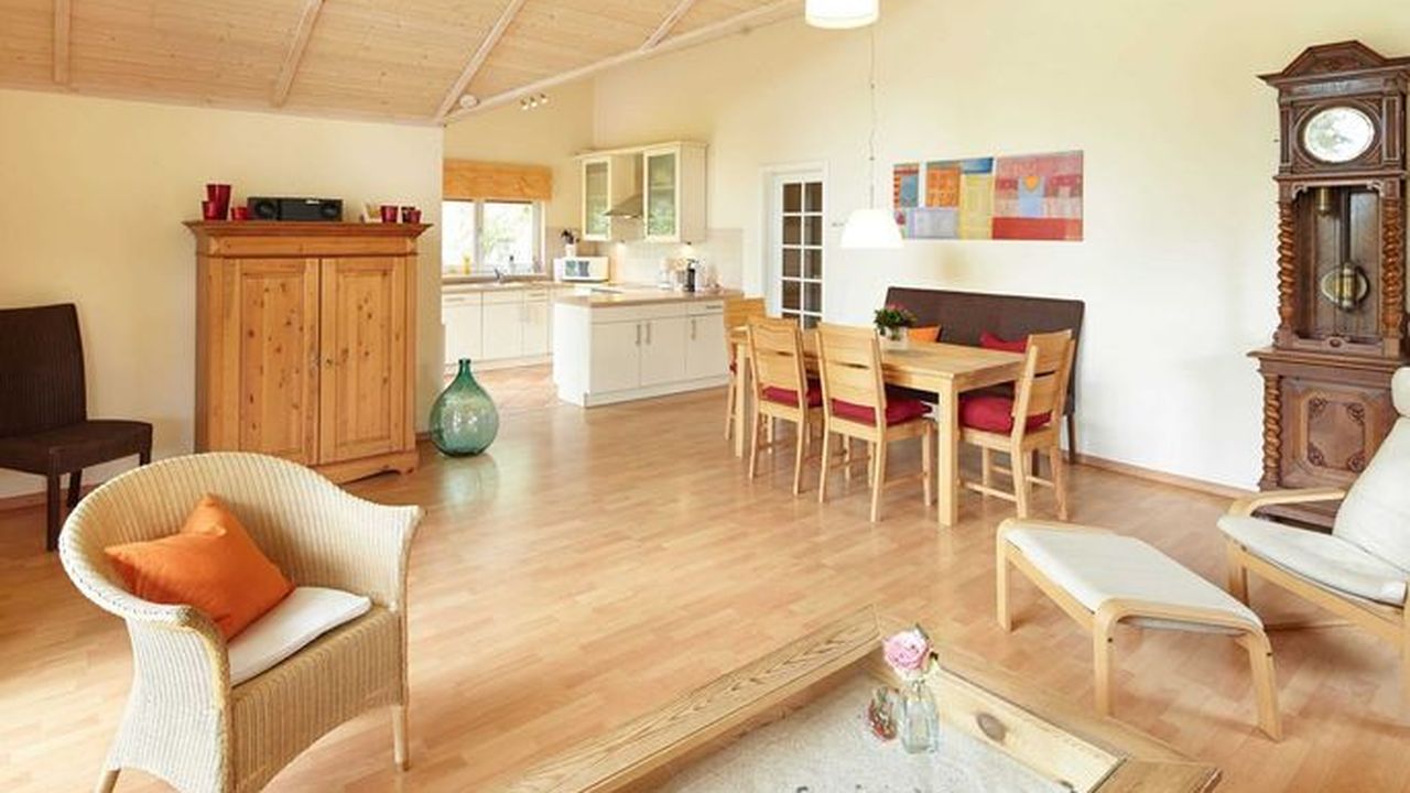 Ferienhaus bis 6 Personen (Nichtraucher)Birkenweg 16, ca. 86 m², Terrasse, eingezäuntes Grundstück, Wohn-Esszimmer mit Sat-TV, Stereo-Anlage mit CD, WLAN, offene Küche mit Backofen, Mikrowelle, Kühlschrank mit Gefrierfach, Geschirrspüler, Schlafzimmer mit Doppelbett (1,40 x 2,00 m), Schlafzimmer mit Doppelbett (1,60 x 2,00), Schlafzimmer mit zwei Einzelbetten, Dusche/WC und separates Gäste-WC, Waschmaschine und Trockner, Kinderreisebett (ohne Matratze) und Hochstuhl vorhanden, Holzkohlegrill, Unterstellmöglichkeit von Fahrrädern, zwei Parkplätze, zwei Hunde erlaubt (5,00 € pro Hund /Nacht), Bettwäsche und Handtücher bitte mitbringen oder spätestens zwei Tage vor Anreise gegen Gebühr bestellen.