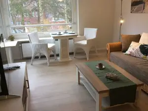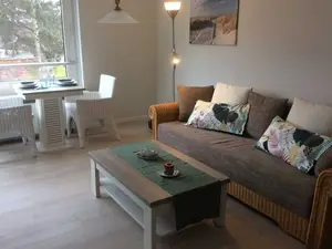 Ferienwohnung bis 3 Personen (Nichtraucher)Rodenbergstraße 32 a, Carpe Diem, Haus 3, ca. 42 m², 2. Etage, Fahrstuhl, Balkon mit Wintermeerblick, Wohnzimmer mit Schlafcouch (1,40 x 2,00 m) und kleiner Essecke, TV, WLAN, Schlafzimmer mit Doppelbett (Breite 1,80 x Länge 1.90 m), separate Einbauküche mit Geschirrspüler und Mikrowelle mit Backfunktion, Kühlschrank mit Gefrierfach, Kaffee- und Espressomaschine, 2-Platten-Ceran-Kochfeld, Dusche/WC, Schwimmbad (tägl. geöffnet ) und Sauna (Freitag bis Sonntag) im Nebenhaus, Schließung Sauna und Schwimmbad wegen Wartung jährlich im November, Münzwaschmaschine und Trockner im Haus, Außenstellplatz, ein Hund erlaubt (5,00 €/Nacht), Bettwäsche und Handtücher bitte mitbringen oder spätestens zwei Tage vor Anreise gegen Gebühr bestellen.