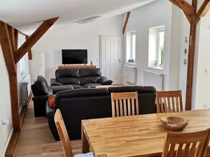 Die Unterkunft verfügt über einen separaten Eingang, kostenfreies WLAN, zwei Schlafzimmer inkl. Bettwäsche, ein Duschbad inkl. Handtücher sowie einem großen und gemütlichen offenen Wohn- und Kochbereich mit Wohnlandschaft, Küchenzeile und einem großen Tisch mit 6 Stühlen.