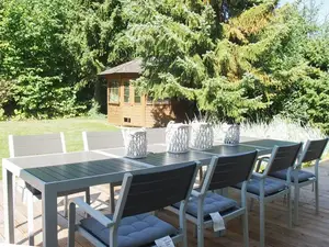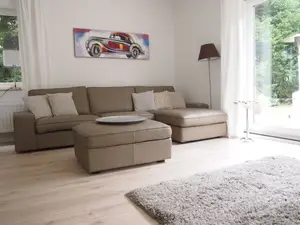 Die 30 qm große Sonnenterrasse ist mit einer Sitzgruppe für 8 Personen ausgestattet. Markise und Sonnenliegen sind selbstverständlich vorhanden. Das Gartengrundstück ist eingezäunt. Waschmaschine und Trockner sind im Keller untergebracht. Es steht ein PKW Stellplatz auf dem Grundstück zur Verfügung.