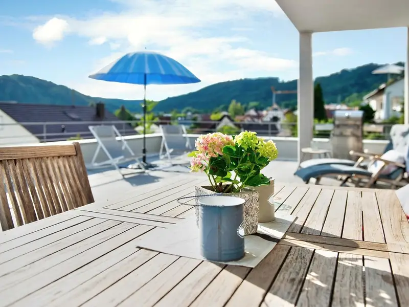 Die Teil-Überdachung der Terrasse ermöglicht wohldosierten Sonnengenuss und verlängert damit Ihre Feriensaison und schöne Abende im Freien.
