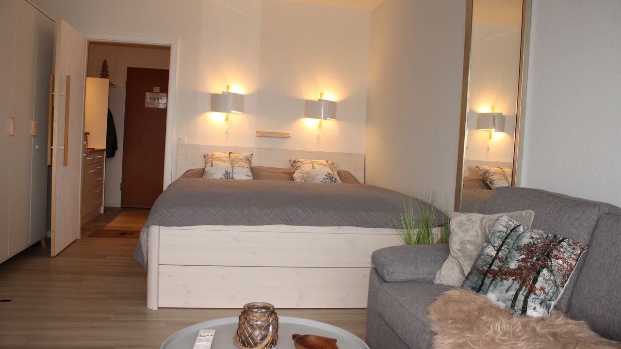Genießen Sie den traumhaften Blick aus unserer sonnigen Ferienwohnung, direkt auf den Kranichsee und Tannenwald im wunderschönen Hahnenklee. Die Wohnung befindet sich am Ende des Flures, hat einen 270 Grad Blick, Südwestausrichtung und wurde vollständig renoviert.Wir laden Sie herzlich ein in unser kleines Apartment mit Balkon und Panoramablick auf den See. Sie finden hier alles was Sie für einen entspannten Urlaub benötigen. Der Balkon, mit zwei Stühlen und einem Tisch, hat schon früh Sonne und am Abend können Sie den Sonnenuntergang genießen. Das große Bett hat eine Liegefläche von 180x200cm. Das Sofa und ein gemütlicher Sessel laden zum Relaxen ein. Die Küche hat ein zweier Ceranfeld, einen kleinen Geschirrspüler, einen Kühlschrank, einen Gastrobackofen und alles was man so in einer Küche benötigt.