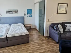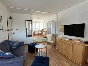 Die Ferienwohnung 27 besteht aus: Wohnzimmer mit Sitzecke, Farb-TV und Süd-Westausgerichteten Balkon, Schlafzimmer mit Doppelbett und TV, erhöhte Essecke mit Seeblick, Küche, Dusche/WC.