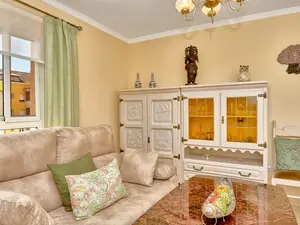 Die Ferienwohnung besteht aus einem schmucken kombinierten Wohn- / Esszimmer mit freiem Blick auf die grüne Palmenoase der Wohnanlage. Vor dem Südfenster des Raumes steht die Couch mit grossem Wohnzimmertisch, der ausreichend Platz bietet, beispielsweise für Tischspiele. In zwei rustikalen Wohnzimmerschränken verbirgt sich das Kaffee, Tee- und Essgeschirr sowie Wasser- / Wein- und Biergläser ebenso wie Schnapsgläschen, Cognac-Schwenker und Sektkelche . Ein runder Esszimmertisch mit vier bequemen Stühlen, ein Sidebord mit Flachbildschirm-TV, ein Mikrowellengerät und eine kleine Musikanlage mit CD-Teil sind ebenfalls vorhanden.