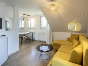 Auch im Wohn- und Essbereich haben wir sehr viel Wert auf klare Linien und Farbgebung als auch auf hochwertige und ökologische Materialien gelegt. Esstisch und Couchtisch sind z.B. aus recycelten Glasflaschen. Ein gemütliches Sofa lädt zum lesen der Urlaubslektüre ein.
