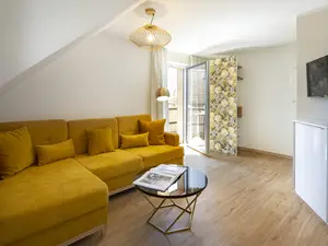 Im gemütlichen Schlafzimmer mit eigenem Balkon finden Sie ein komfortables Boxspringbett sowie adäquate Staumöglichkeiten. Besondere und nachhaltige Materialien verschönern Ihren Schlaf und lassen Sie geborgen fühlen.