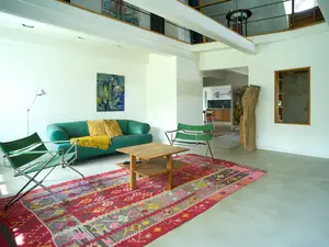 Die zu vermietende Haushälfte ist modern und individuell eingerichtet. Sie betreten das Haus über eine geräumige Küche, die in einen bis zum First geöffneten Wohnbereich mit umlaufender Galerie übergeht. In dieser loftähnlichen Architektur befindet sich oben der Schlafbereich mit frei zugänglichem mit schwarzem Schiefer gefliesten Bad. Neben Küche und Wohnbereich gibt es unten noch eine gemütliche, reichhaltig ausgestattete Bibliothek, mit ausgewählter Literatur und Kunst, sowie ein kleines Schlaf und Ankleidezimmer und ein separates Gäste-WC. Es wurden nur echte Baumaterialien wie massive Eiche,Schiefer , Messing und Stahl verwendet. Viele der Designer Möbel sind vom Hausherrn entworfen und in Handarbeit hergestellt.