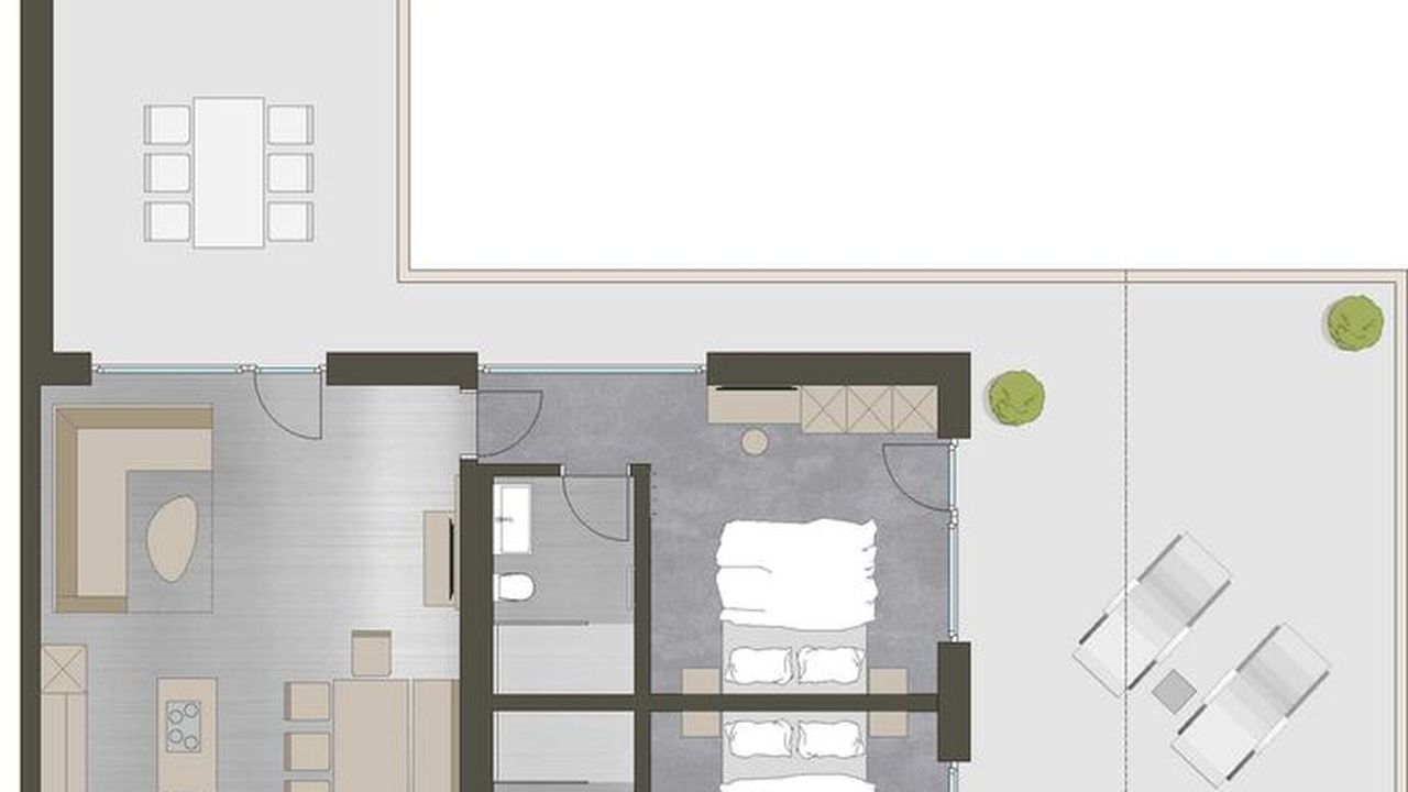 Auf der fast 80m2 grossen Terrasse, die südseitig, teilweise überdacht und mit Outdoormöbeln ausgestattet ist können sie entspannen, ihr Frühstück oder an lauen Abenden Ihr Abendessen genießen.