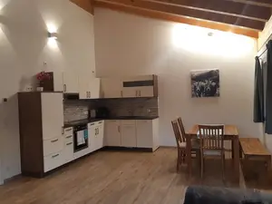 Die ab Sommer 2022 vermietete Ferienwohnung liegt im 1. Obergeschoss.Die gemütliche Wohnung mit sichtbarem Dachstuhl besteht aus einer großer Wohnküche mit Zugang zum Südbalkon, einem Schlafzimmer,