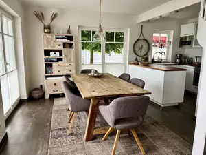 Sollten Sie das Los gezogen haben, Ihre Mannschaft zu verköstigen, ist das auf keinen Fall eine Niete. Die offen gestaltete Küche bietet an hochwertiger Technik und Ausstattung alles, was das Kochherz begehrt und lässt die vermeintliche Arbeit zur Freude werden. Bis ins kleinste Detail liebevoll eingerichtet. Es liegt sogar ein Kindergeschirr bereit. Die direkt an den Essbereich angrenzende Terrasse verbindet den Wohnbereich mit der Natur und verspricht gesellige Grillabende der besonderen Art mit dem Ofyr-Grill oder romantische Candle-Light Dinners bei traumhafter Kulisse und Ambiente Beleuchtung.