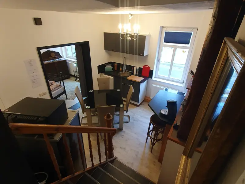 Die Ferienwohnung befindet sich im 1. Sock eines Altbaues nur 50 Meter entfernt vom "historischen Hafen" an der Werra und dem "Hafenrestaurant Zur Schlagd", ein wunderschönes Ausflugsrestaurant. Aus dem Fenster blickt man auf einen gegenüber liegenden, großen Garten, in welchem Tiere frei herumlaufen. Es gibt Hirsche, Rehe, ein Emu, ein Schaf, ein Wildschwein und abends hört man die Rufe der Pfauen.Verfügbare Zusatzleistungen