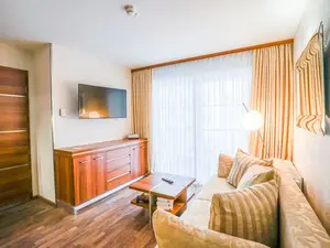 Die 40 qm großen Deluxe Apartments verfügen über einen kombinierten Schlaf- und Wohnraum sowie ein separates Kinderzimmer. Sie sind für maximal zwei Erwachsene und zwei Kinder bis 16 Jahre ausgelegt. Zu den Deluxe Apartments gehört jeweils entweder ein Balkon oder eine Terrasse.Bad mit Fußbodenheizung