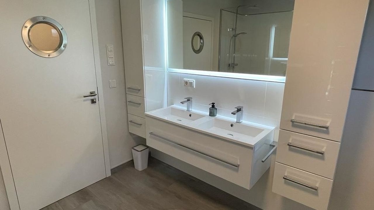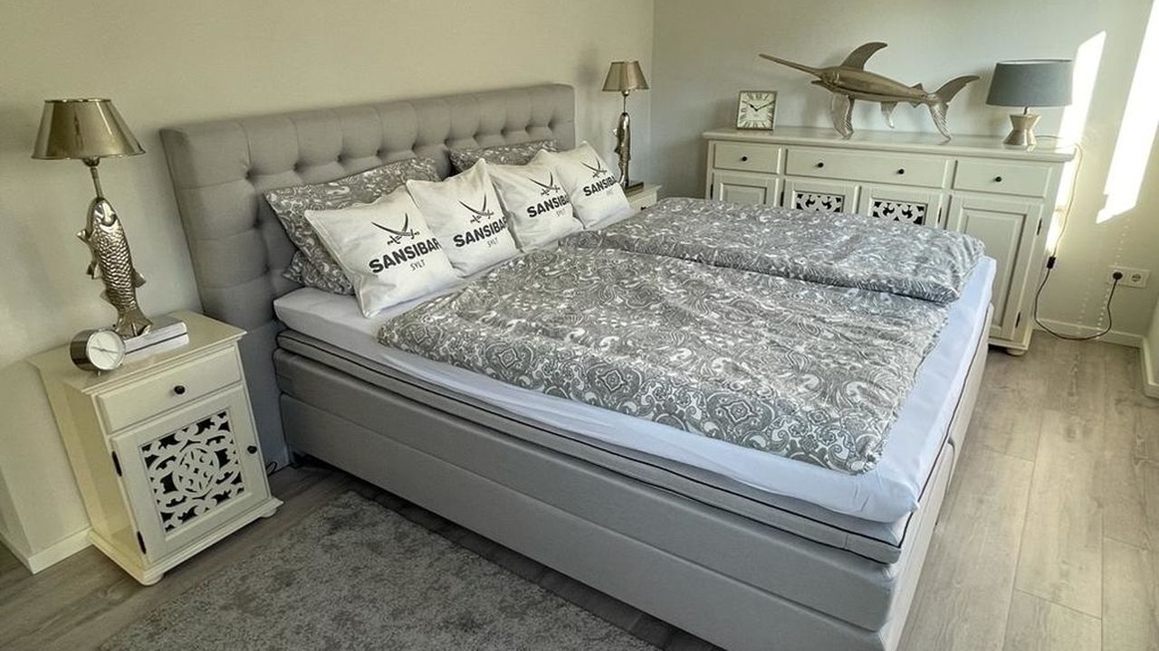 Der großzügige kombinierte Wohn- und Essbereich mit offener Küche und der dazugehörige 22 qm große Balkon zur Wasserseite bieten Ihnen einen einzigartigen Ausblick. Ein Schlafzimmer mit einem zweiten, großen Balkon zur ruhigen Gartenseite, ein Bad mit Doppelwaschtisch, Dusche und Badewanne, sowie ein Gäste-WC komplettieren das Angebot. Bezogene Betten, weiche Hand- und Badetücher, freies W-Lan, kostenfreier SKY-Zugang (incl. Bundesliga / Sport / Filme) und ein gemütlicher extra großer Sylter Strandkorb auf dem Balkon zur Wasserseite sind inklusive. Designerlaminat und Fliesen in Holzoptik und eine Fußbodenheizung in allen Räumen sorgen ebenso wie die liebevoll ausgesuchten Wohnaccessoires für Gemütlichkeit.
