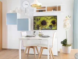 Der Tisch im Essbereich mit 2 Stühlen ist multifunktional und kann durch seine technische Ausstattung auch als Schreibtisch genutzt werden. Ganz selbstverständlich verfügt das Apartment über einen kostenfreien Internetanschluss, einen internetfähigen Smart-TV und ein Bluetooth-Radio.