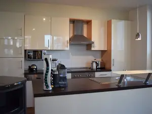 Die voll ausgestattete Küche wird durch einen Küchenblock mit Tresen vom Wohn- und Essbereich getrennt. Hier können Sie nach Herzenslust kochen oder einfach gemütlich einen Kaffee genießen (eine Nesspresso- und eine Filterkaffee-Maschine stehen zu Ihrer Verfügung).
