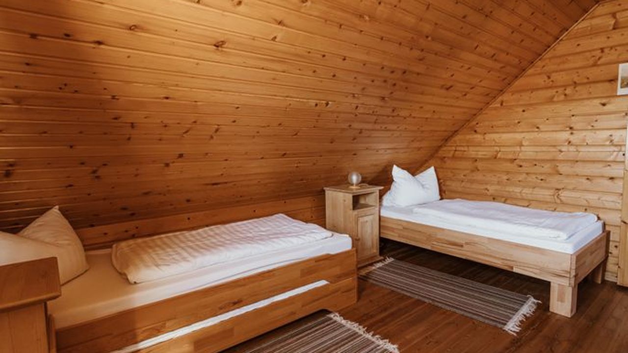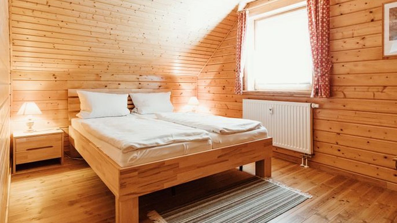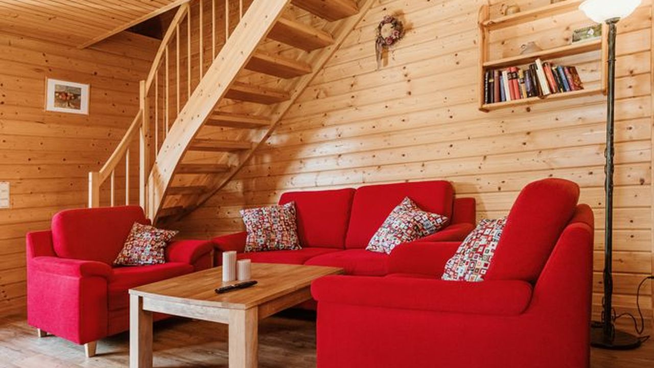 Die Doppelhaushälfte in Holzbauweise bietet auf rund 65 m² Wohnfläche Platz für bis zu fünf Personen. Im Erdgeschoss befinden sich ein Wohn- und Schlafbereich mit Couch, ein separater Essplatz, SAT-Flachbild-TV, HiFi-Anlage, eine voll ausgestattete Kochnische mit Geschirrspüler und Mikrowelle, ein Abstellraum sowie ein Gäste-WC.Das Dachgeschoss umfasst zwei Schlafzimmer eines mit Doppelbett und eines mit zwei separaten Betten sowie ein Bad mit Dusche und WC.