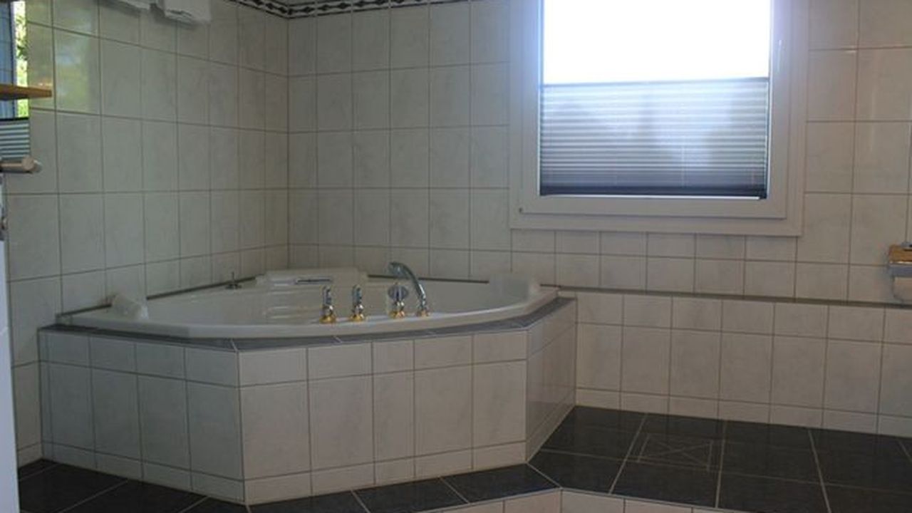 Das Bad im verfügt über ein WC, eine Dusche, eine Badewanne und über einen großen Waschtisch.