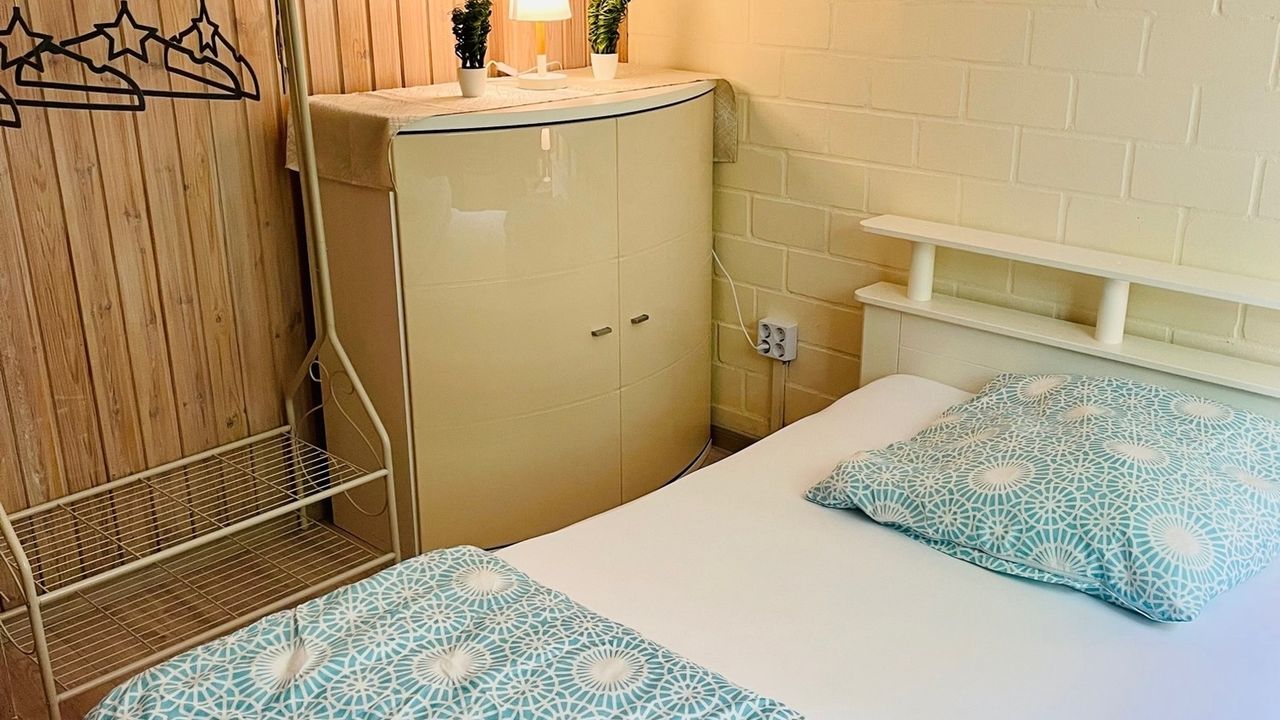 Das an den Wohnraum angrenzende Schlafzimmer ist mit genügend Stauraum und einem Multimedia Smart-TV ausgestattet.