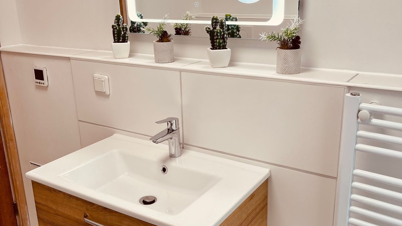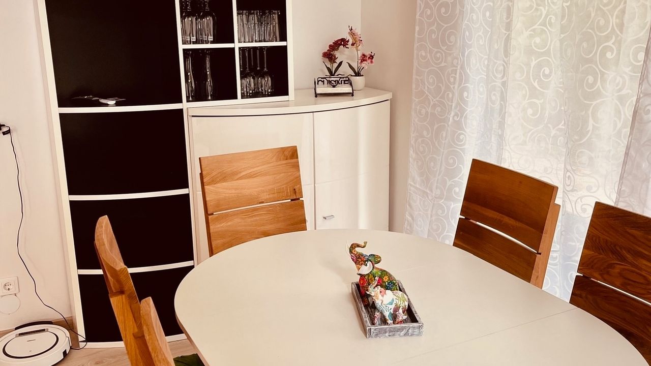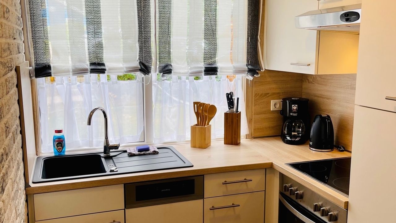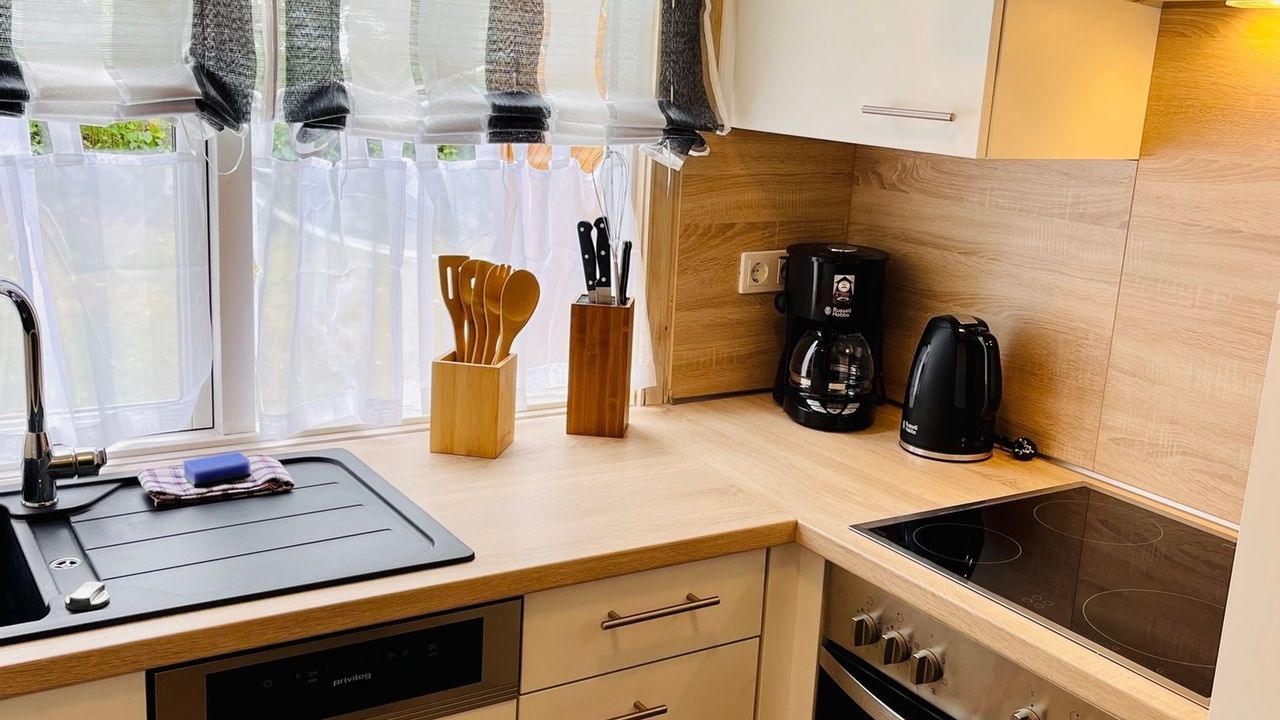 Die zum Wohnraum offene und neue Küche verfügt u.a. über einen Backofen und Ceranfeld, Geschirrspülmaschine, einen Kühlschrank mit Gefrierfach, Mikrowelle, Toaster, Wasserkocher und viele weitere wichtige Utensilien.