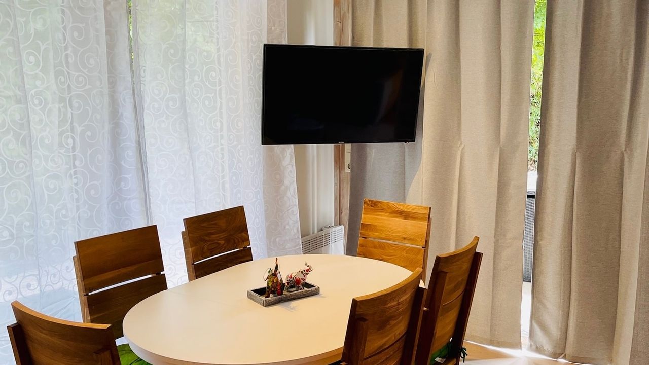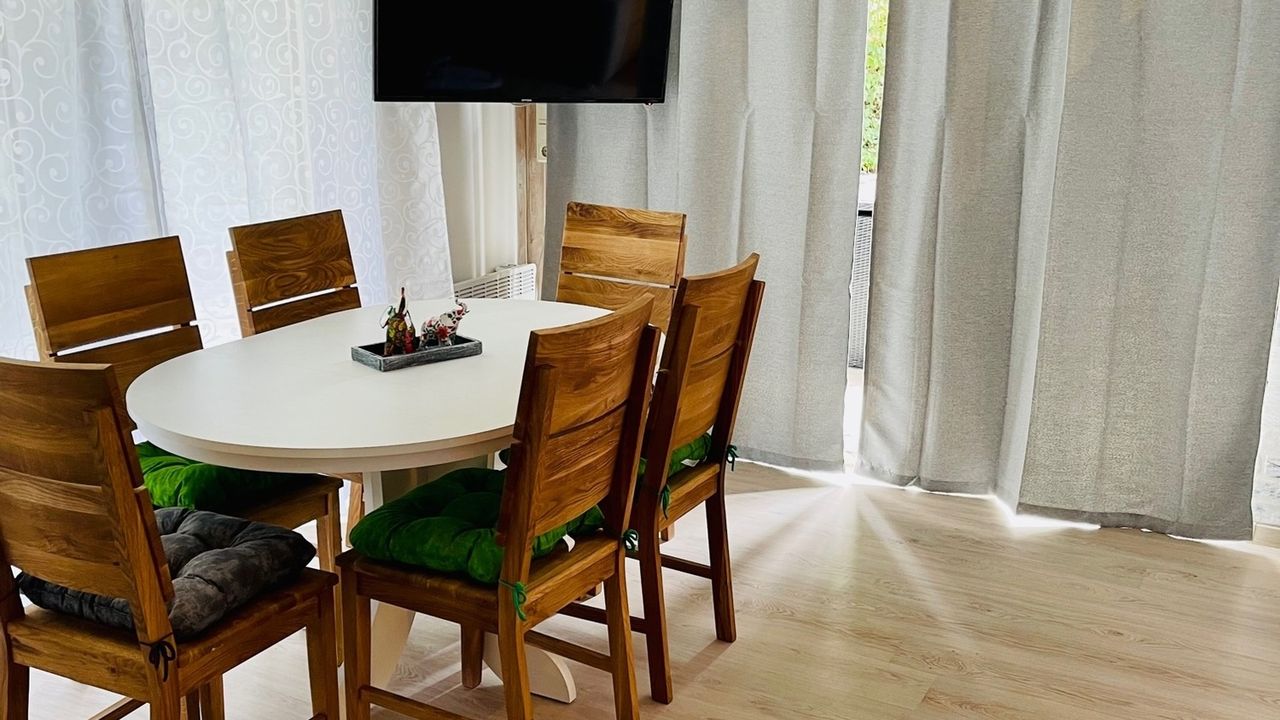 Im Wohnraum befindet sich eine bequeme Sitzlandschaft, ein Essplatz für 5 Personen, sowie ein großer LCD-TV mit Smart-Funktionen und ein Kaminofen.