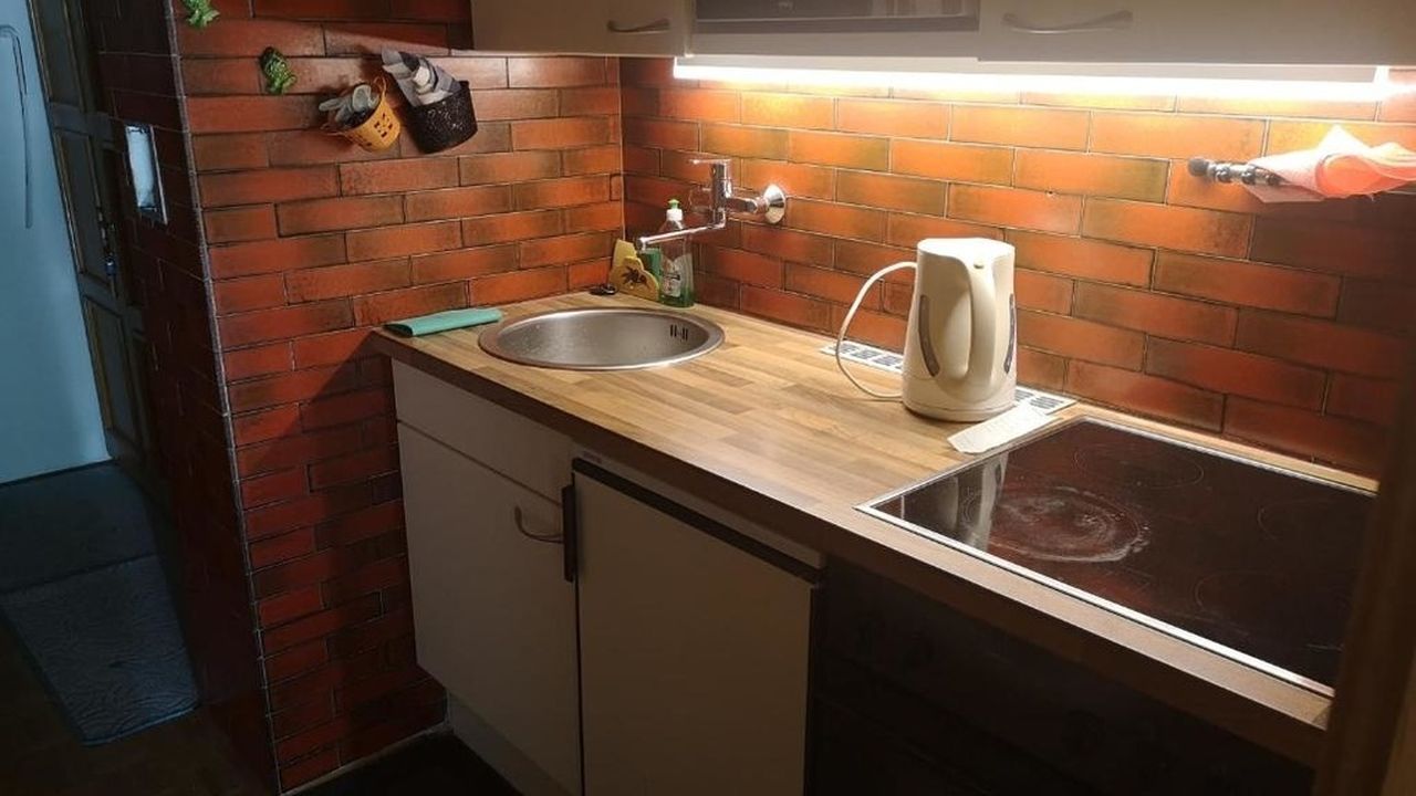 In der gut ausgestatteten Küche finden Sie neben einem Kühlschrank auch eine Mikrowelle und einen Backofen.