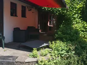 Über die Terrassentür geht es auf die große Südwest-Terrasse. Dort können Sie zusammen mit Ihrem Hund entspannt Ihren Urlaubstag aufklingen lassen.
