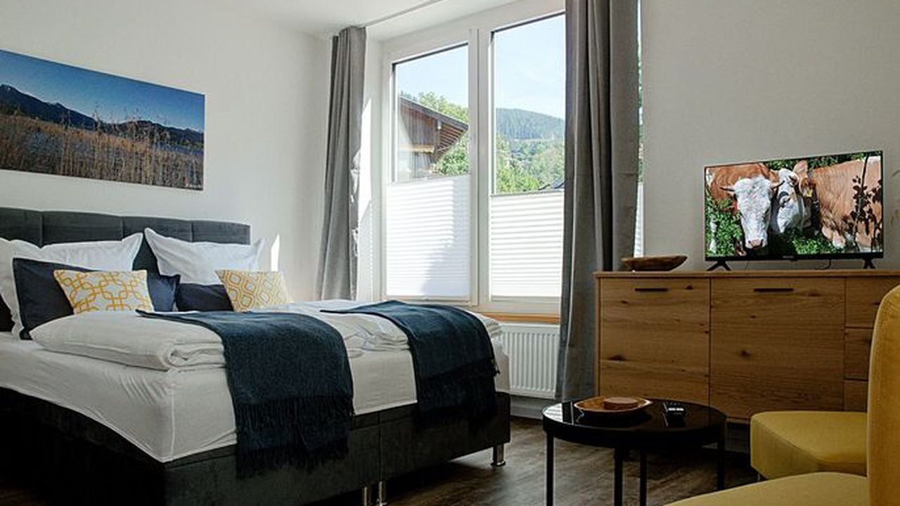 Das Ufer des Tegernsees erreichen Sie bequem zu Fuß in ca. 5 Minuten - dort erwarten Sie Seeufersteg, Schiffsanlegestelle, Promenade, Cafés und Restaurants.