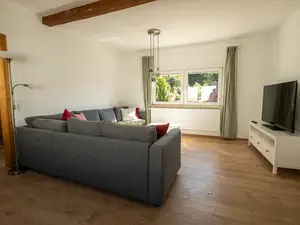 • 1 Großes Wohnzimmer mit gemütlichem Sofa und einem 55" Flachbildschirm, Büchervitrine