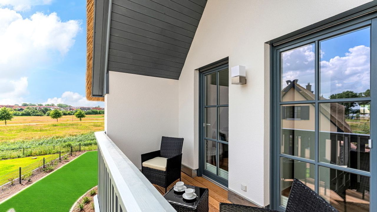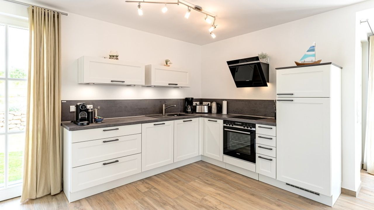 Richtige Urlaubsstimmung kommt auf dem schönen Balkon des Ferienhauses auf. Die gut ausgestattete Küche besitzt unter anderem einen Kühlschrank, einen Herd zum Kochen und sogar eine Spülmaschine.