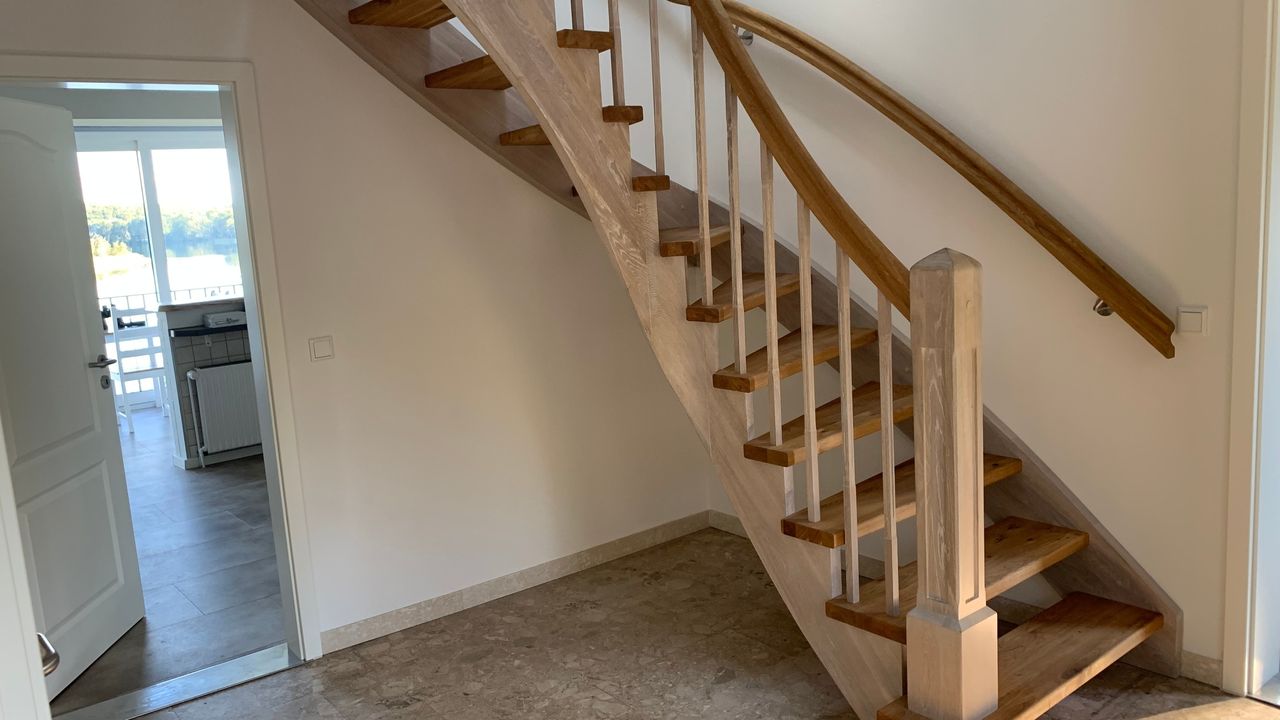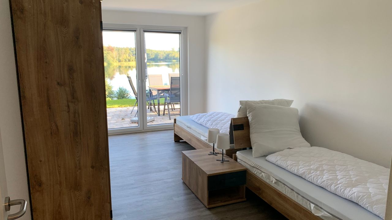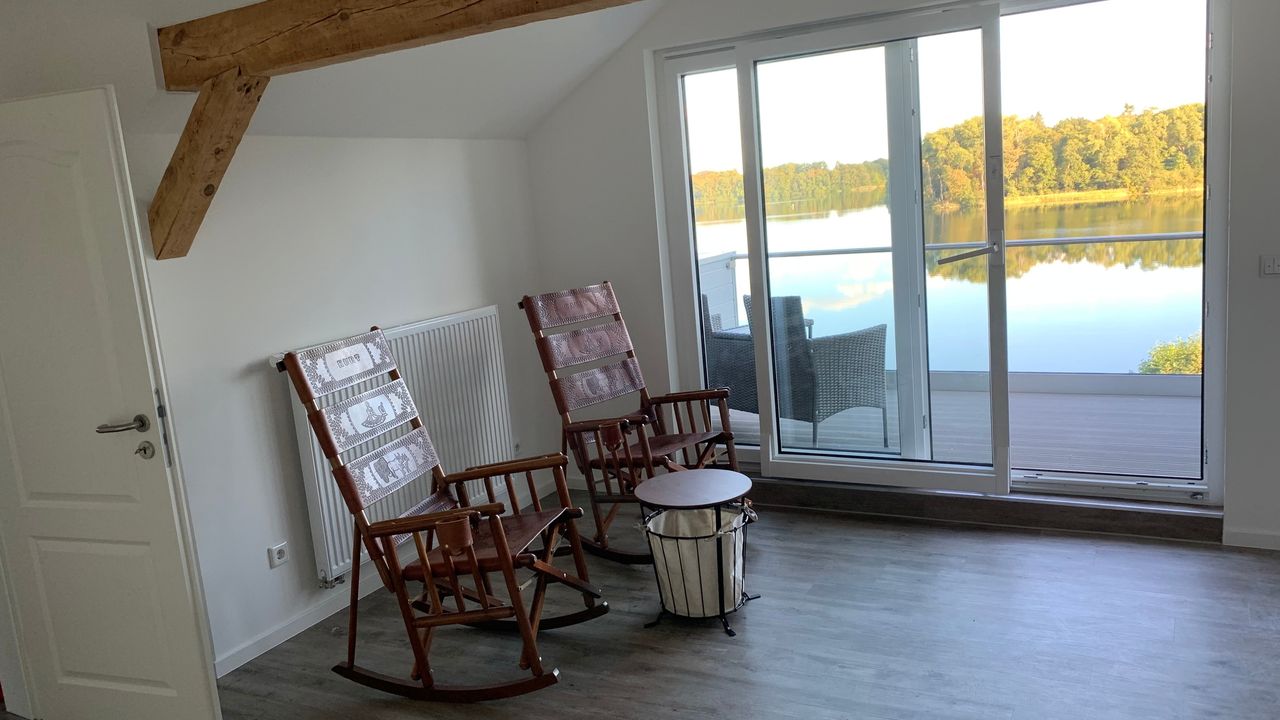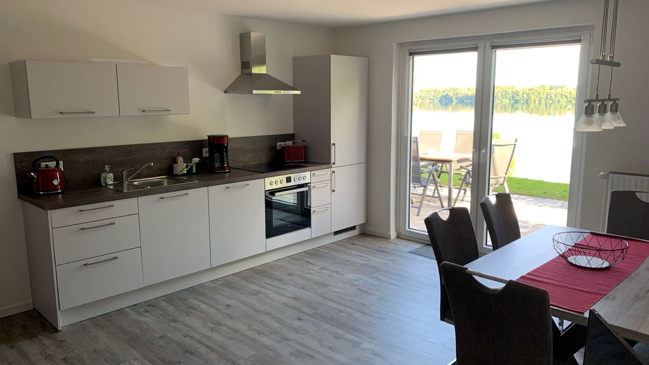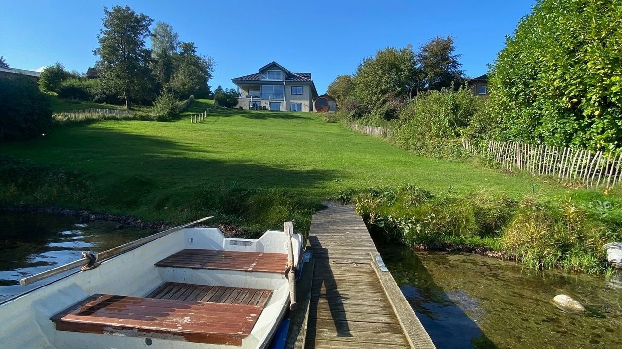 Die Unterkunft bietet eine unvergleichbare Aussicht auf den Stocksee, zu dem man durch das Grundstück direkten Zugang erhält. Der großzügige Garten von dem aus zum Badesteg sowie Ruderboot gelangt werden kann, ist mit modernen Lounge- und Gartenmöbeln ausgestattet.