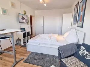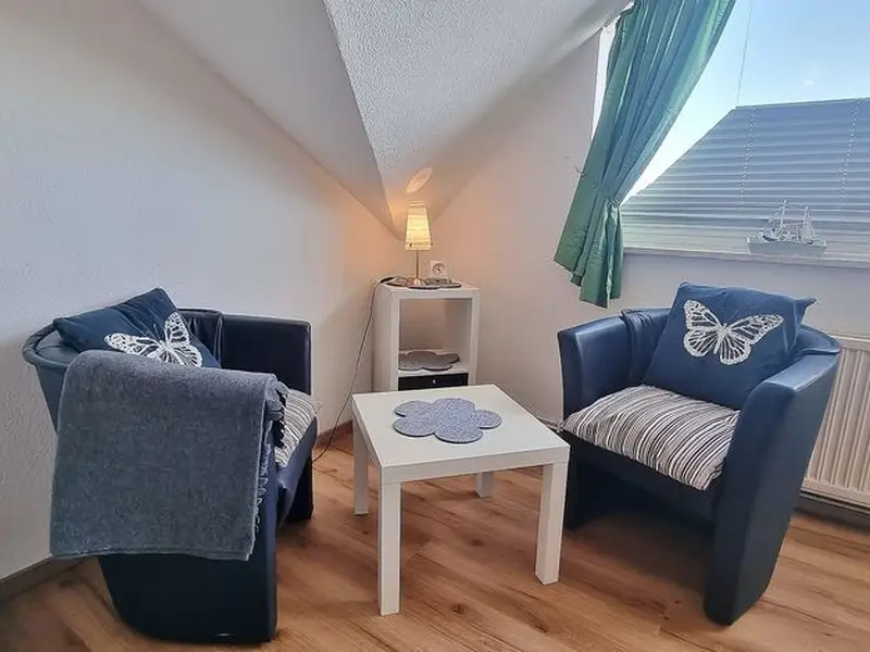 Helles, modern eingerichtetes Wohn- / Schlafzimmer mit Aussicht auf die Kirchenstraße und teilweise über die Dächer von Grömitz. Das Wohn- und Esszimmer ist mit einer kleinen Essecke, einem Doppelbett (2x 80 x 200cm), 2 Sessel und einem 2-türigen Kleiderschrank ausgestattet. Die Wohnung ist mit Laminat-Fußboden ausgelegt. Eine Ministereoanlage mit CD und ein Flachbildschirm sorgen für Unterhaltung.